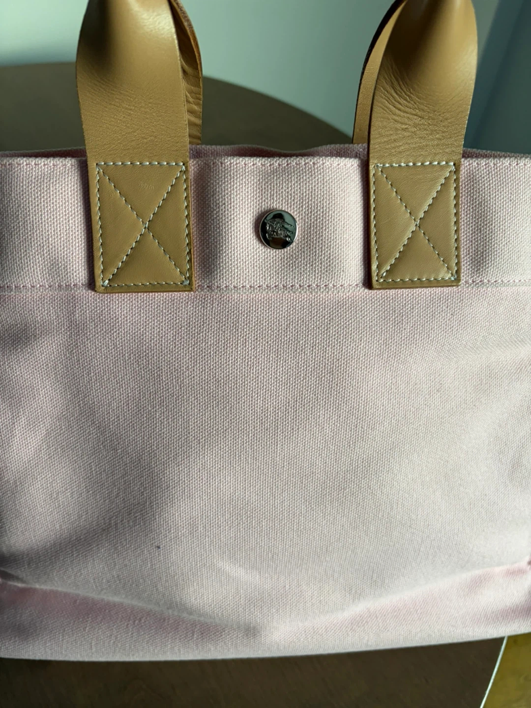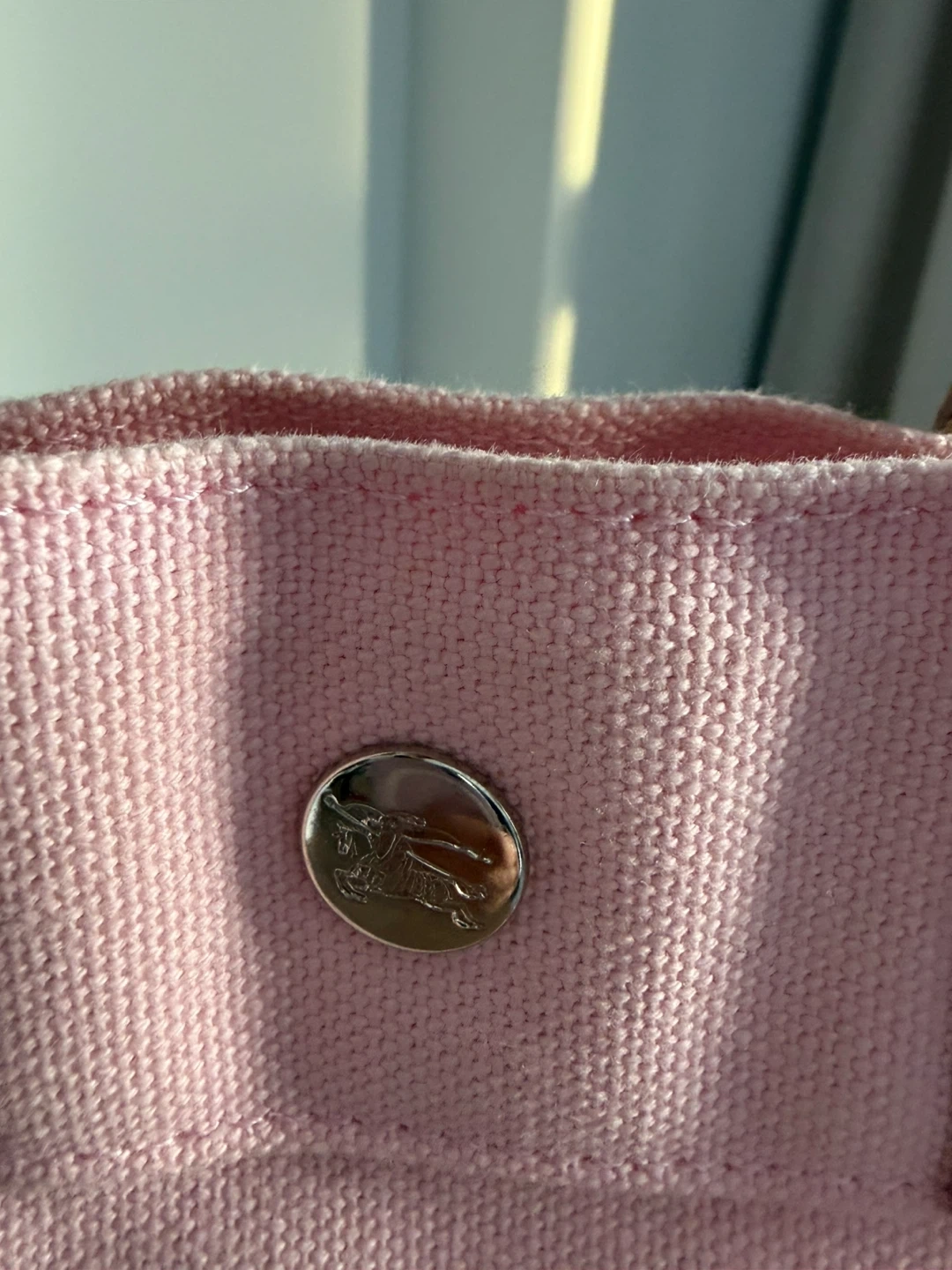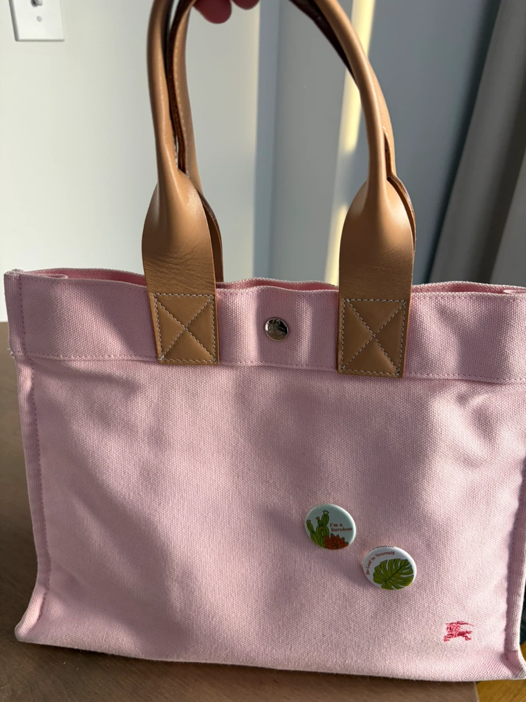 This is a pink canvas tote bag from Burberry. It features leather handles and a snap closure. The iconic Burberry equestrian knight logo is embroidered on the front. Call out small discoloration spot in the front , I cover it with my favorite pins as shown in the pic . You could put some cute patches or use it as is . Very cute color , it will need wash but not as yet .
