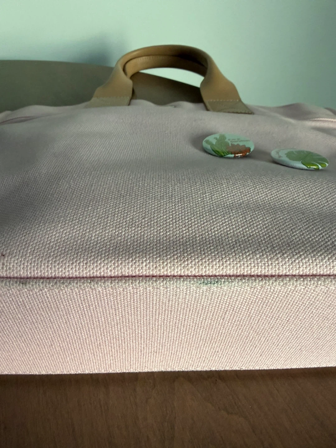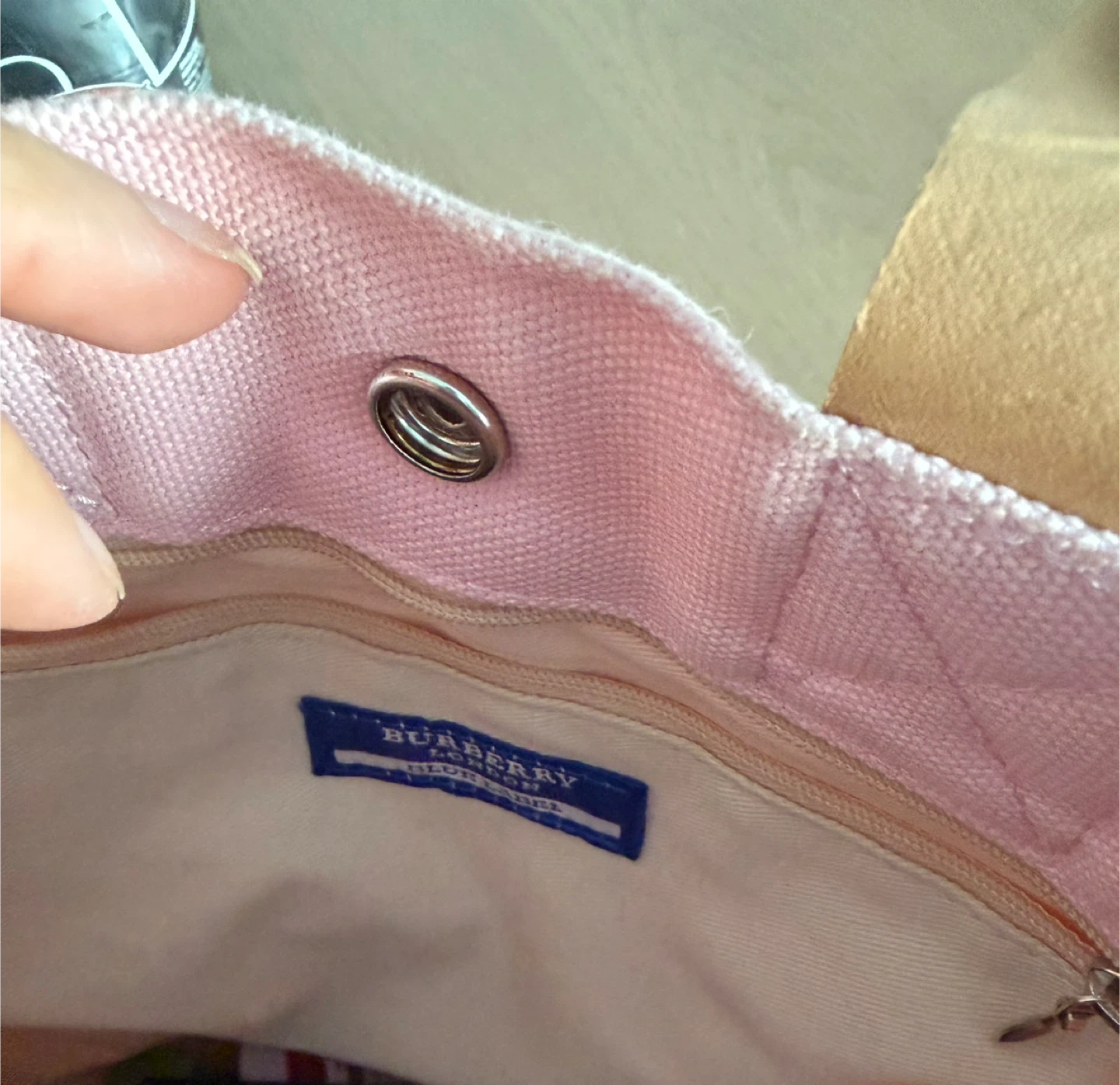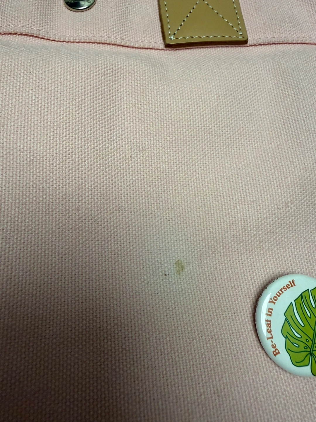 This is a pink canvas tote bag from Burberry. It features leather handles and a snap closure. The iconic Burberry equestrian knight logo is embroidered on the front. Call out small discoloration spot in the front , I cover it with my favorite pins as shown in the pic . You could put some cute patches or use it as is . Very cute color , it will need wash but not as yet .