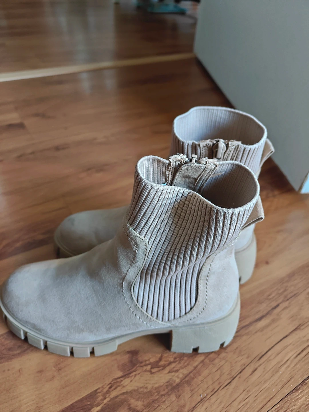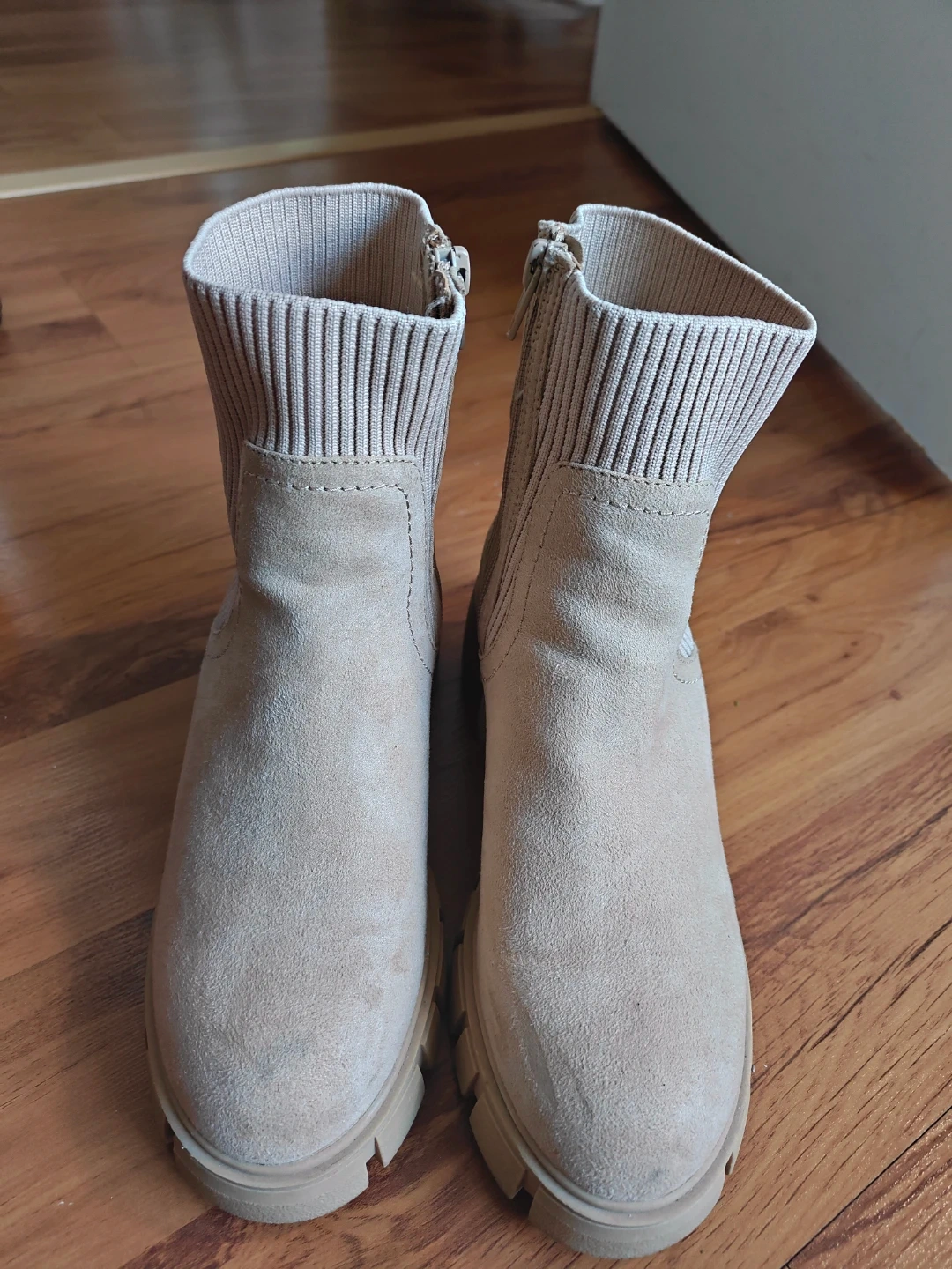 Selling a pair of beige ankle boots. They feature a chunky sole and a sock-like upper. They are in great condition and ready for a new owner!