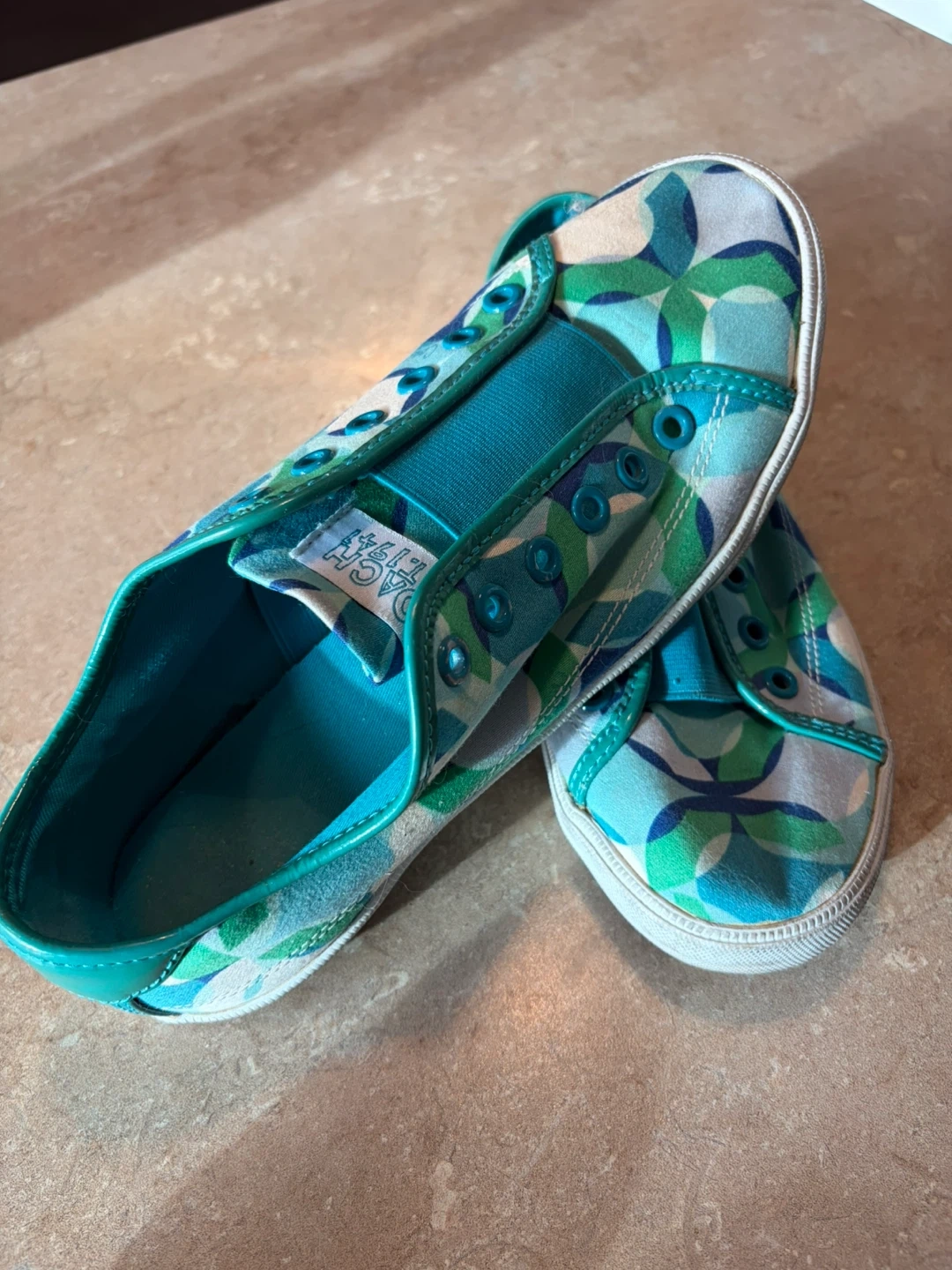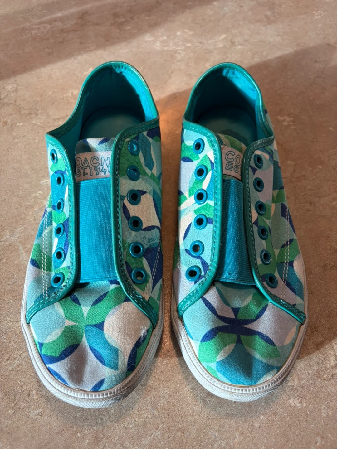These are pre-owned Coach slip-on sneakers in a women's size 8.5. They feature a colourful green and blue geometric pattern. The canvas upper and textile lining make them comfy for everyday wear.