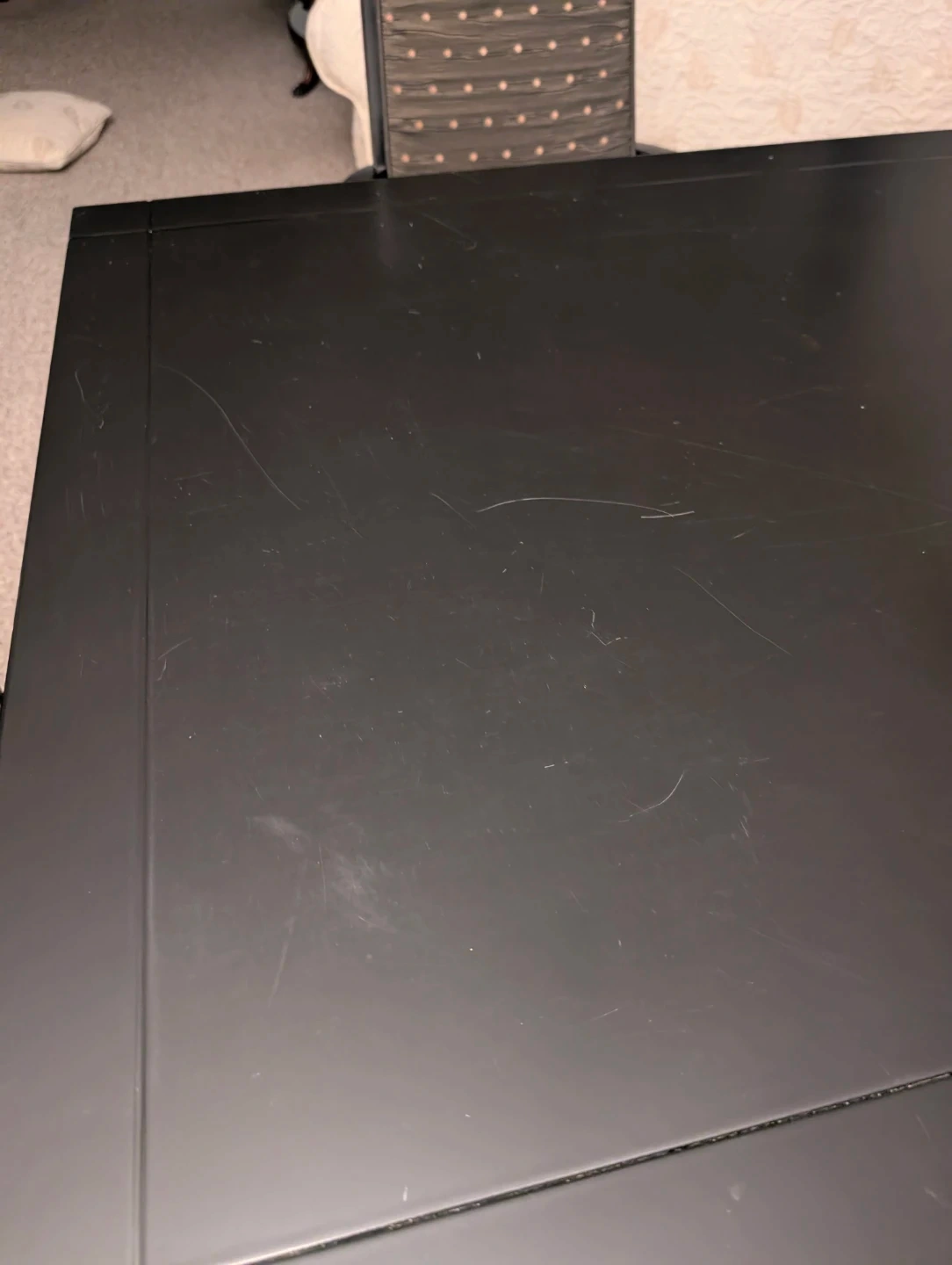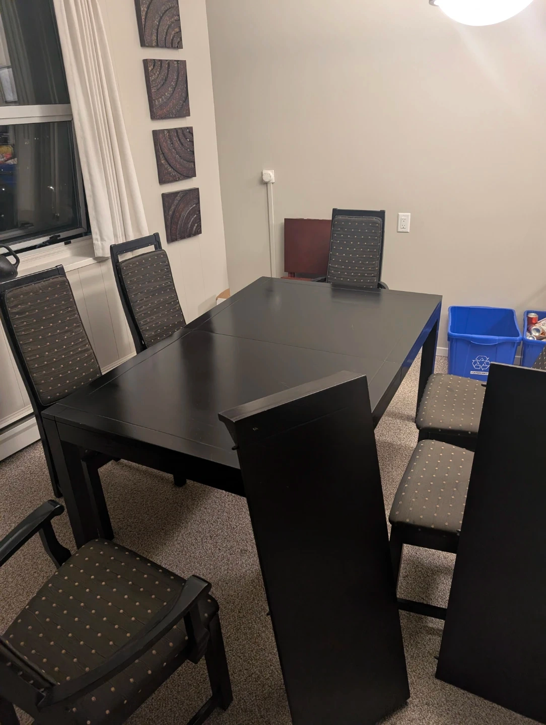 This is a black dining table set that includes the table and four chairs. The table surface has some visible scratches. It's a great set for family meals or entertaining guests.