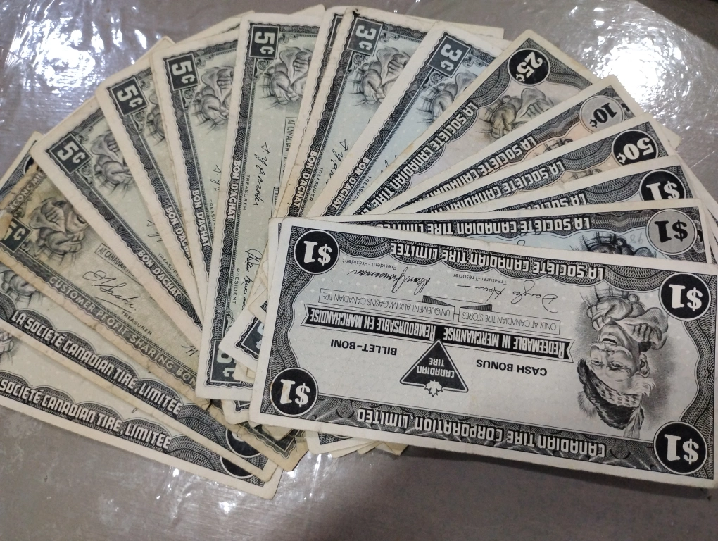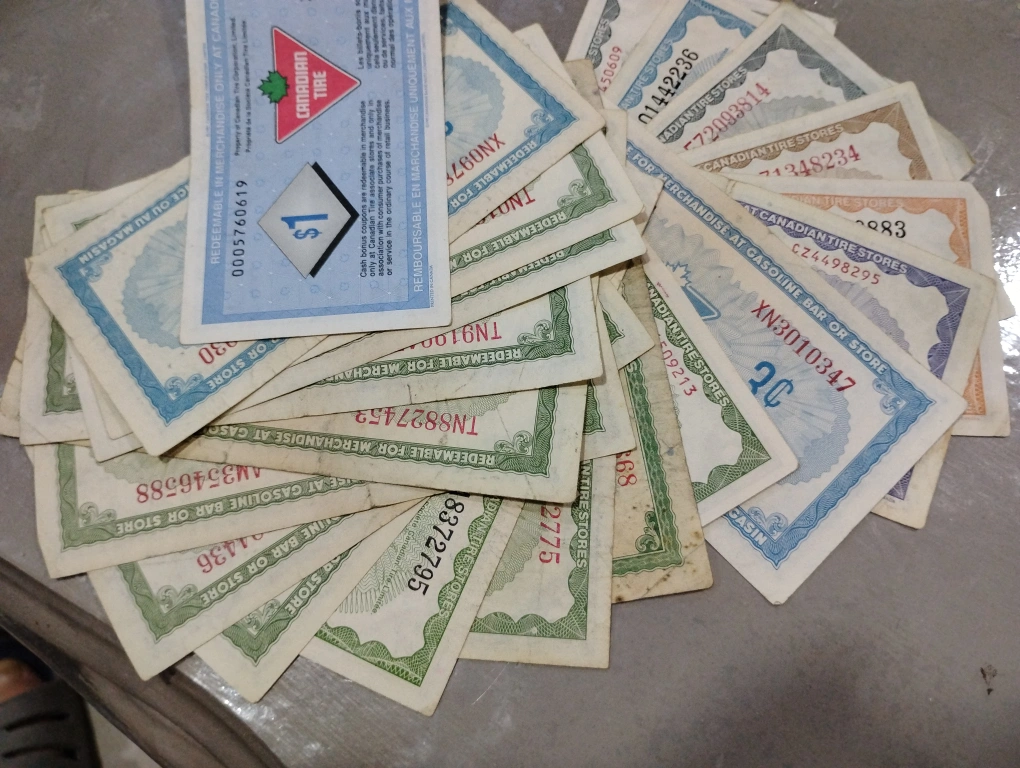 Selling a collection of vintage Canadian Tire money! There's a variety of denominations, from 5¢ to $1. A fun piece of Canadian history!