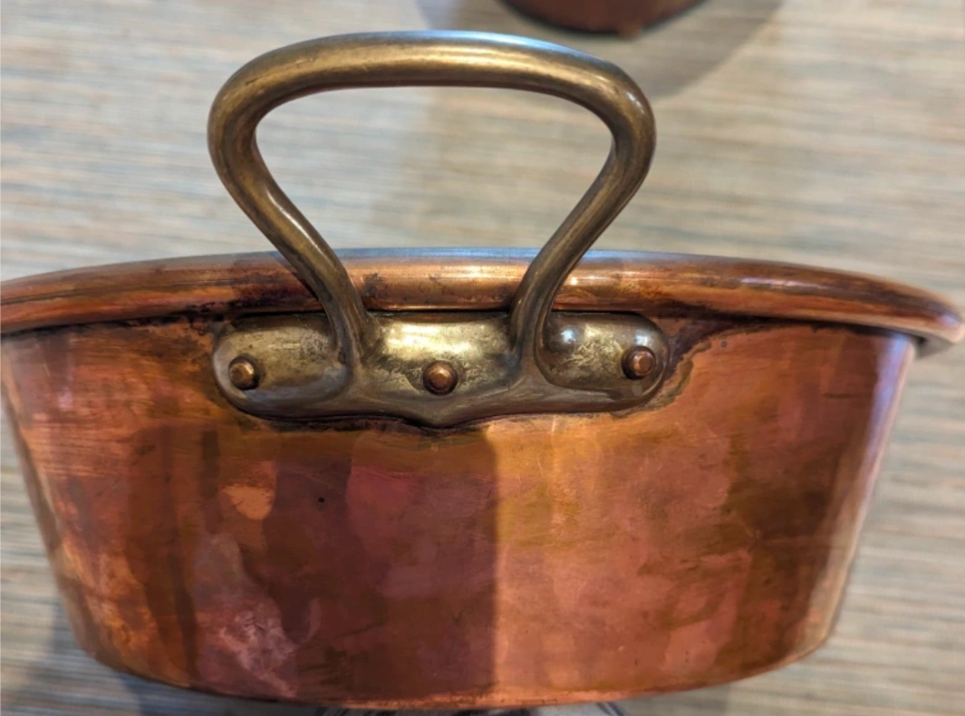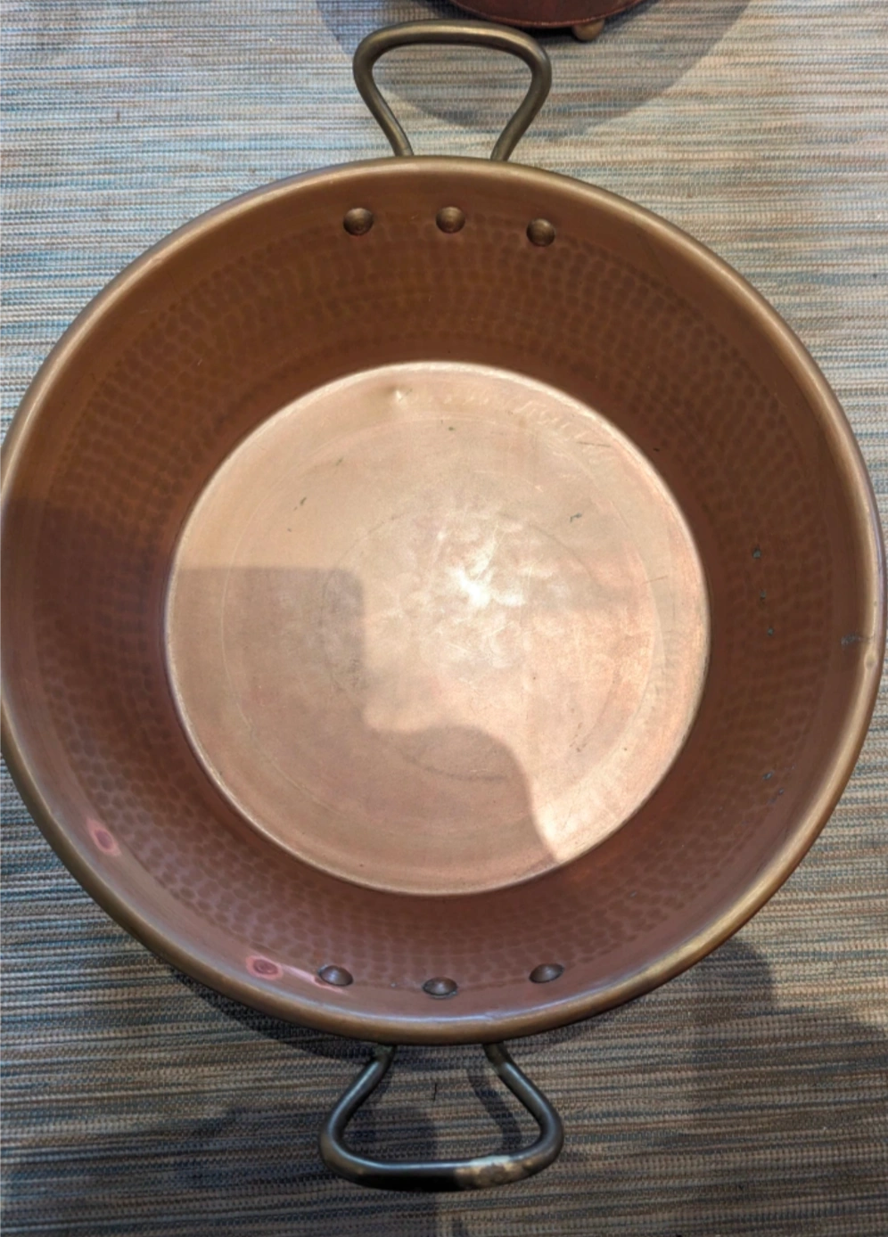 122A great piece of history! A classic French copper preserve pan for making jellies and jams. The copper cookware has two brass handles on either side. Made in France dating from the early 20th century, the kitchen pot is a very large size and features the traditional wide diameter and deep sides. The top circumference is 15 inches, the bottom circumference is 11 3/4 and it's 5 inches high. Worth $400+ on collection sites.