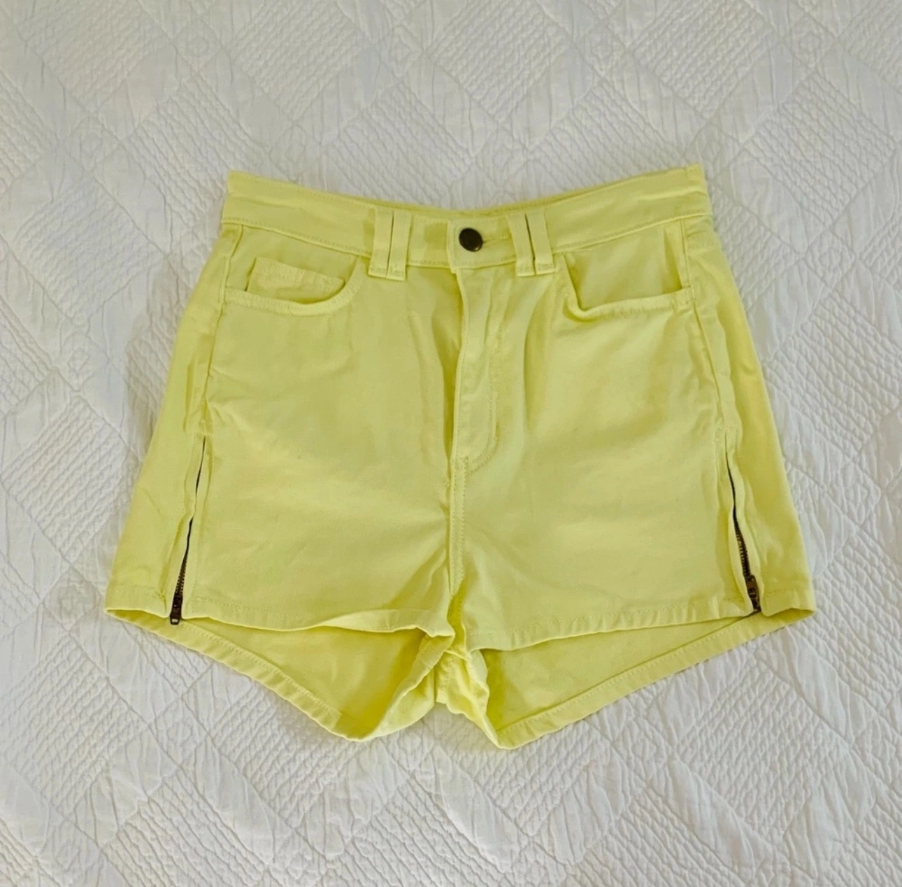 I’m selling American Apparel high waisted shorts in size 26/27. It’s brand new and never worn before in perfect condition. Features zippers on both sides of the short legs. Vibrant yellow colour.