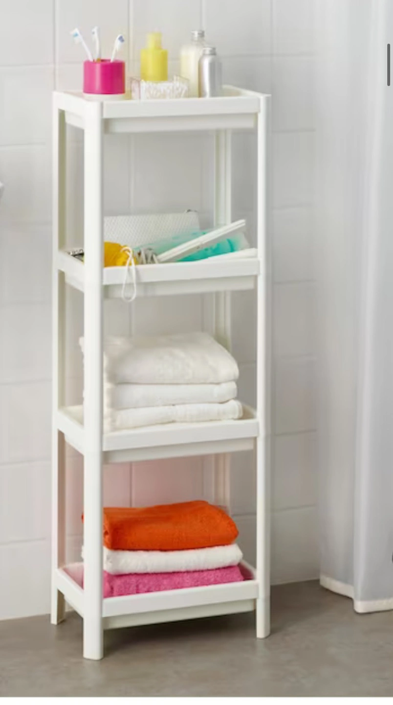 Moving sale- white sturdy plastic storage shelf unit. Store alot of things. Ideal for washroom / kitchen - takes less space. fits long items easily. Like new condition. Can be disassembled into smaller shelf or used as trays separately.