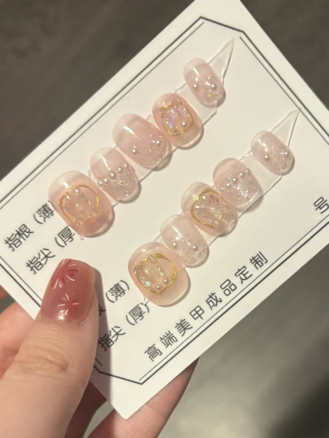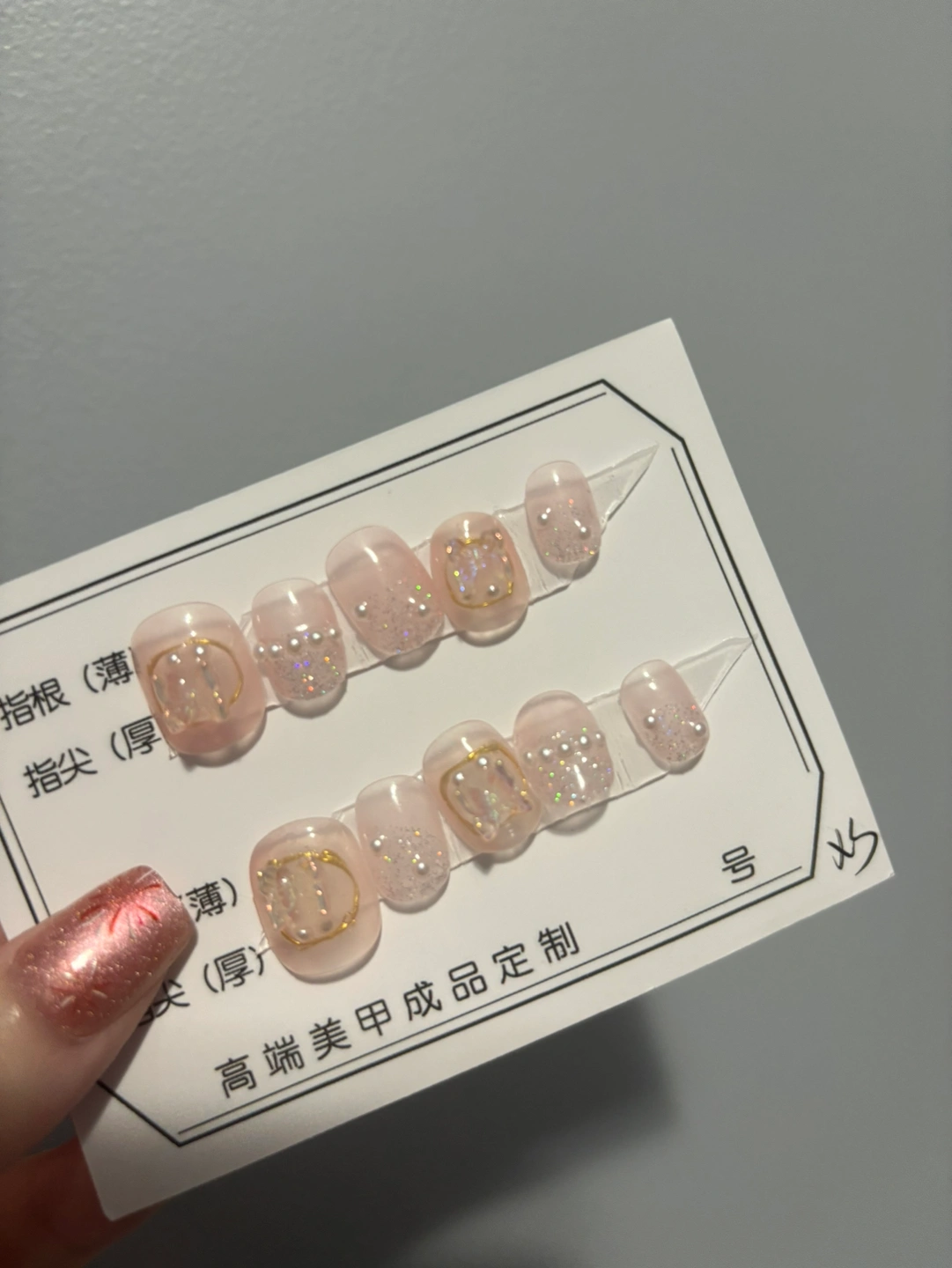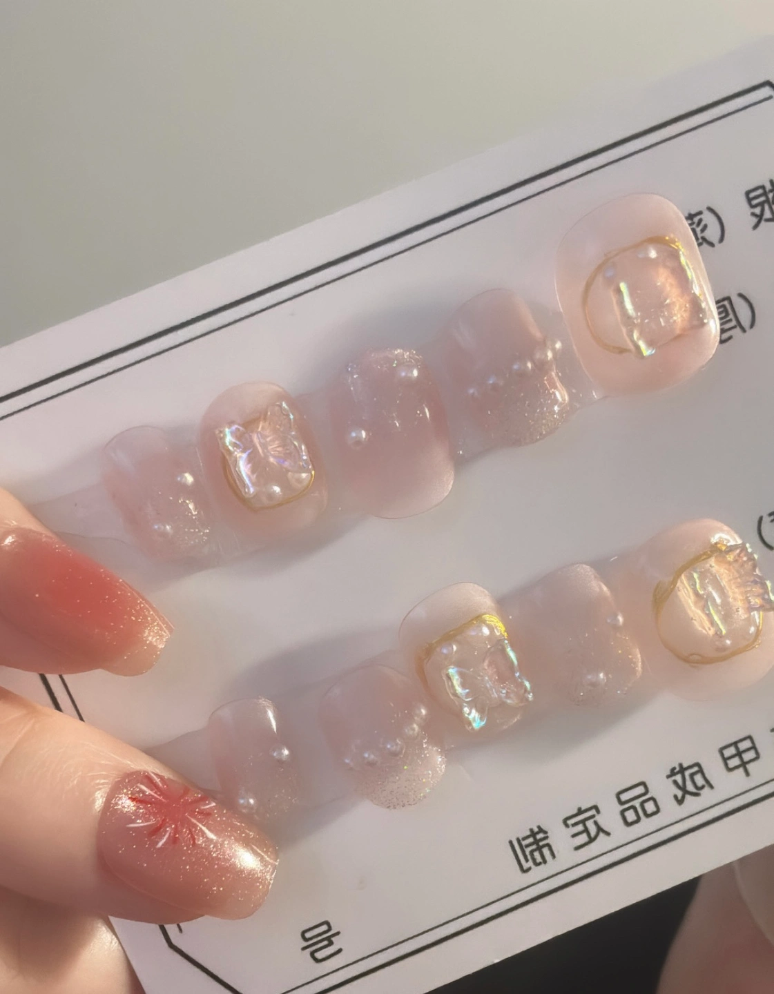 these ethereal Korean style handmade press on nails are perfect for summer! These are not the flimsy bendy 24pc nails, they are way more sturdy and made from gel! they are $5 for the full set and the size is XS-S nails. Super sturdy and perfect and easy to do house hold work/typing since they aren’t too long and pointy at all.