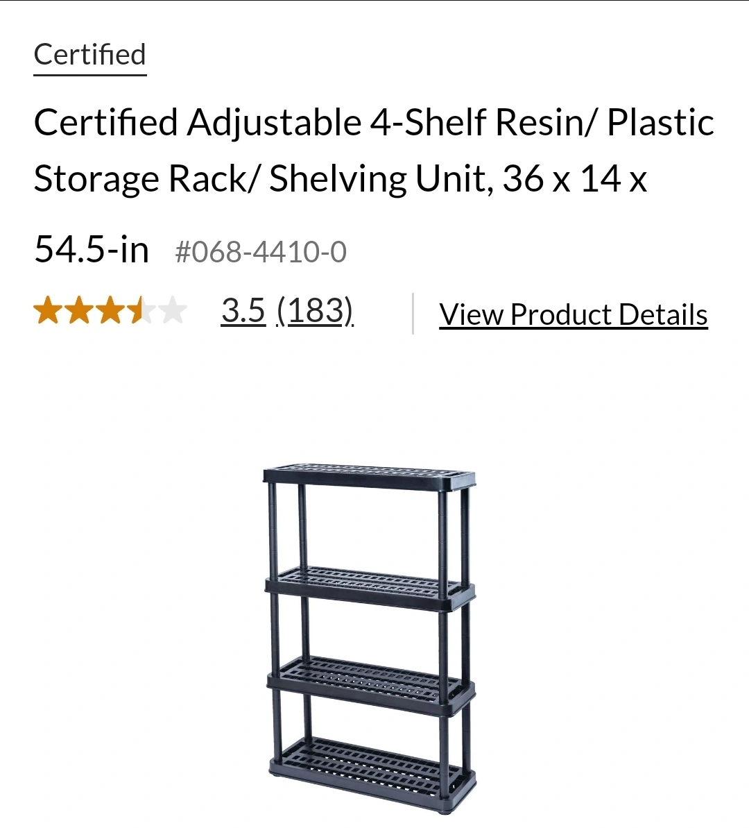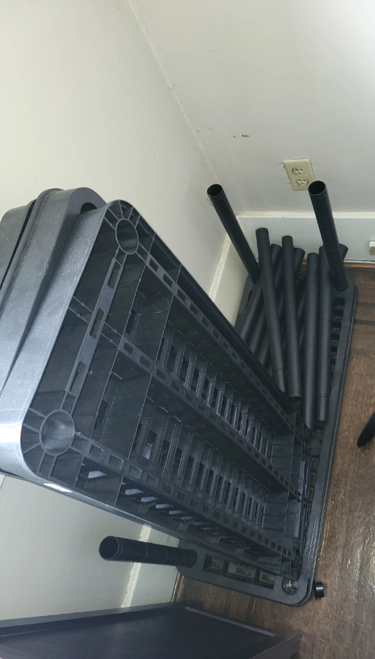 Black plastic shelves. I used them as a makeshift closet and as kitchen storage in different houses.