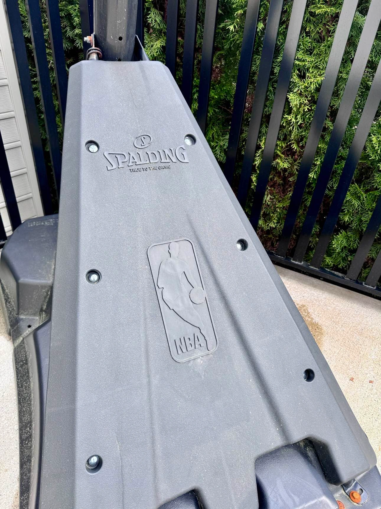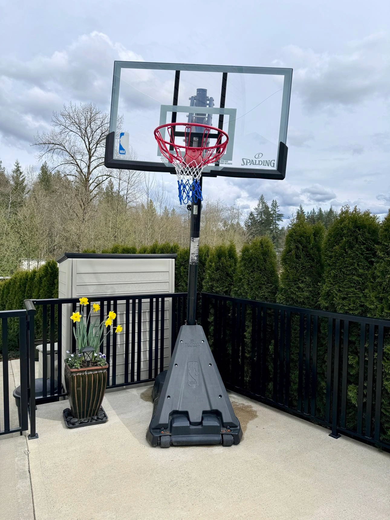 Spalding Base Acrylic Basketball System with a front cover rebounder during play and two wheels for portability