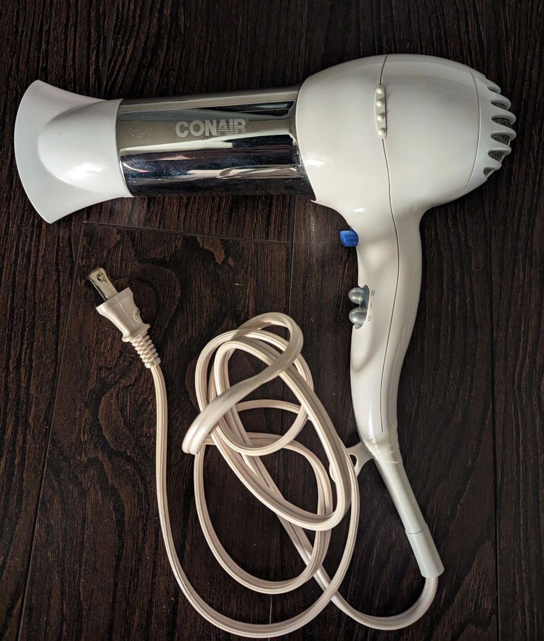 Conair hair dryer. Adjustable speed/temperature settings with hot and cold air.
