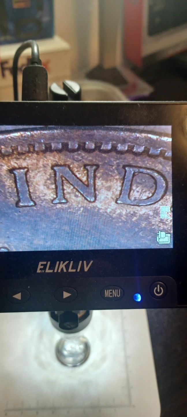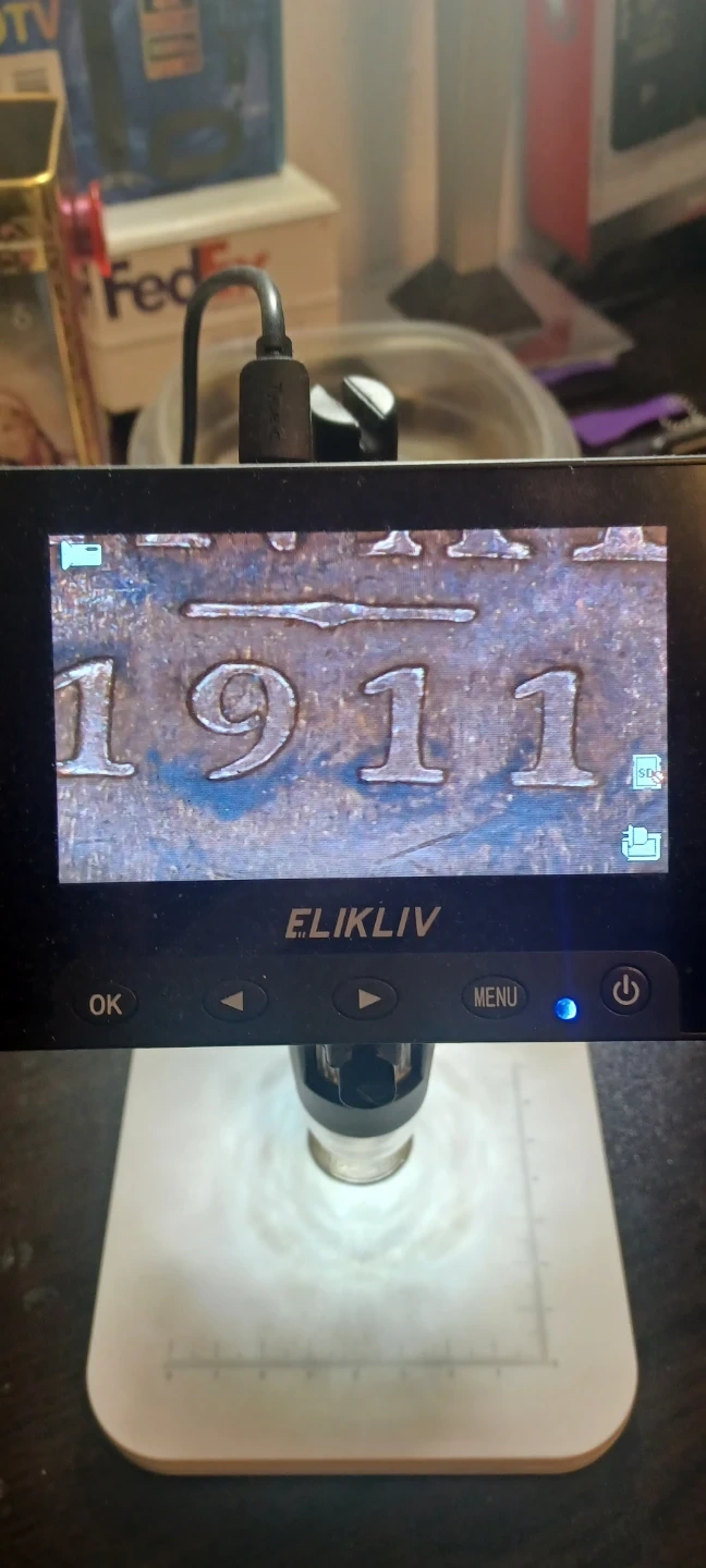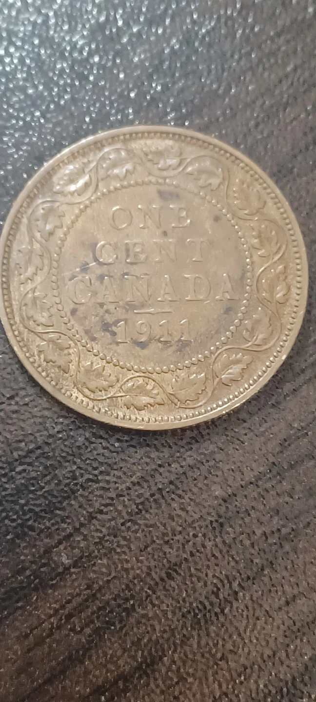 79Selling a 1911 Canadian One Cent coin. It has some wear and tear, as expected from a coin of this age, but it's still a neat piece of Canadian history!..can anyone explain why it has a tiger stripe...letter is dark but the coin surface has that stripe..?
