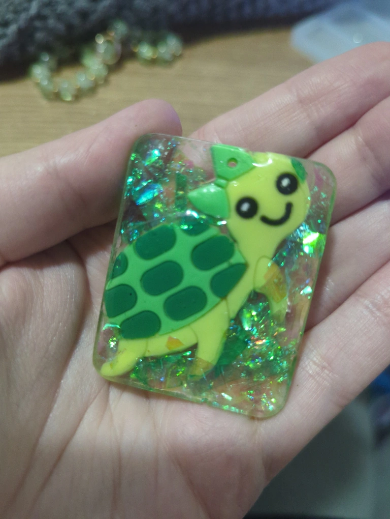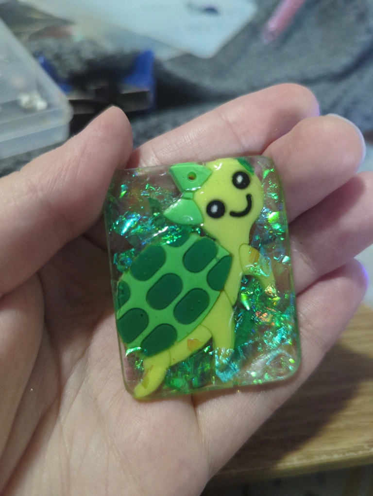 i work on resin and love making charms and more out of resin. this cute little guy is homemade crafted with resin and sparkles ✨