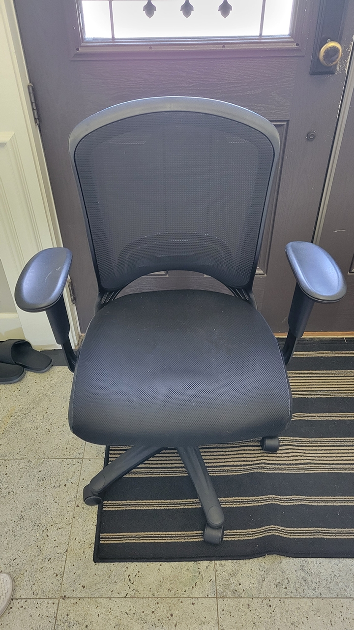 Ergonomic Black Swivel Office Desk Chair. Swivels 360 degrees left or right. Comfortable seating and provides back support. Good condition.