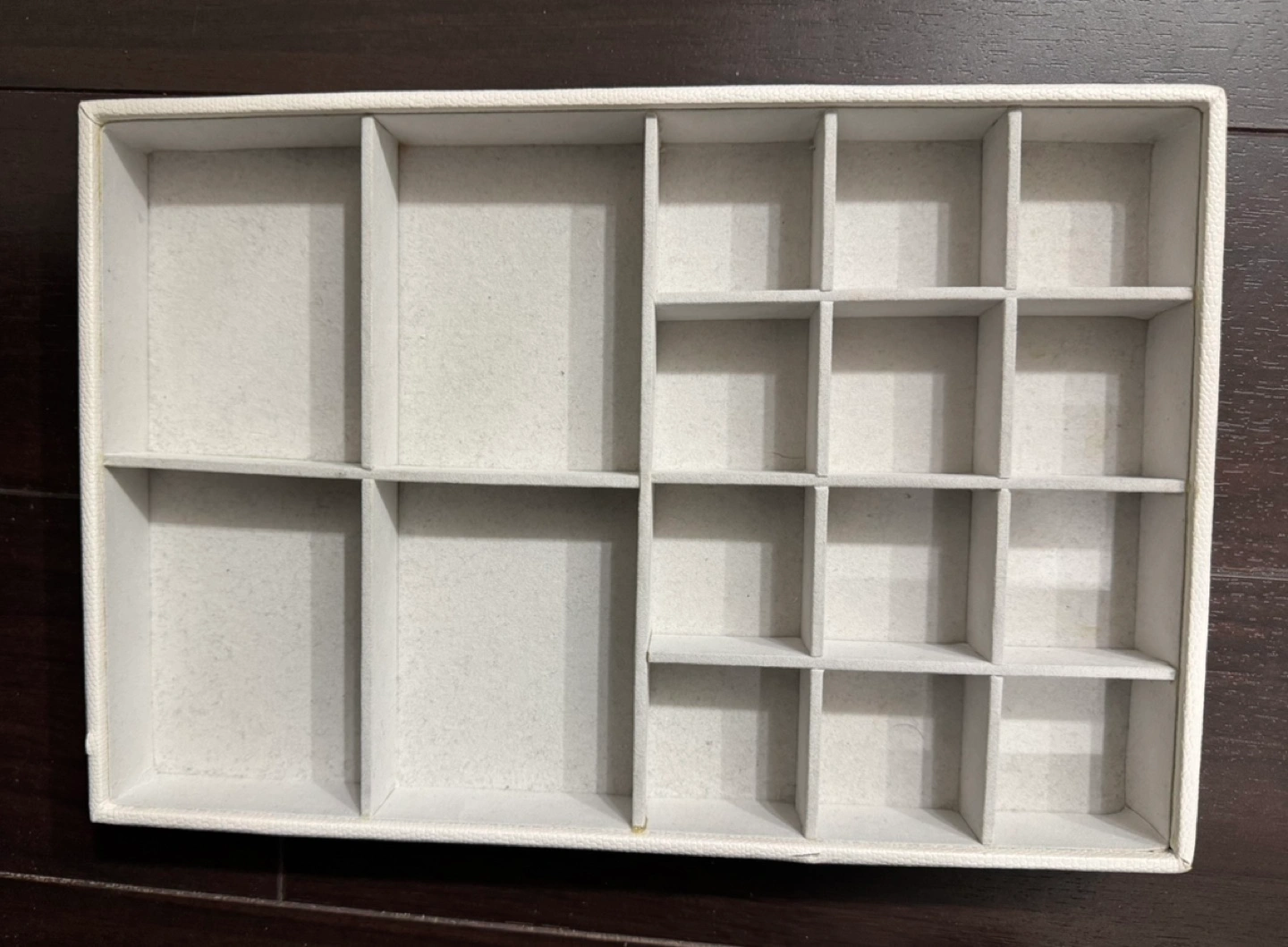 Off-white jewellery tray. Perfect for storing earrings, rings, and other small jewellery. Faux leather exterior. Great for organizing your jewellery collection.