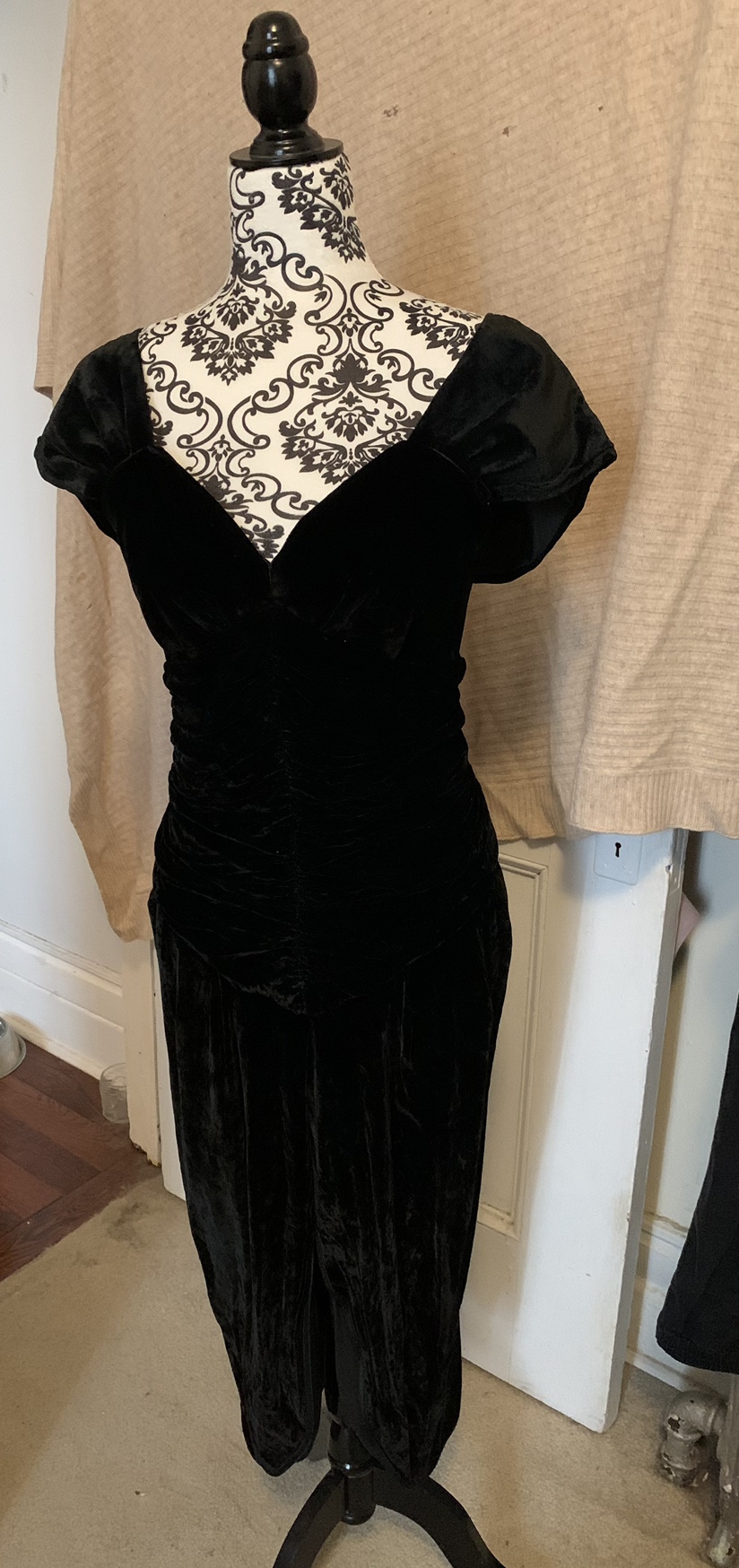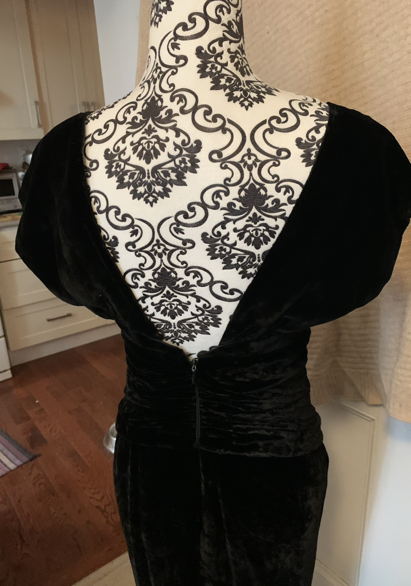 Absolutely va-va-voom black velvet cocktail dress with a ruched waist and tulip hem. Excellent condition from the early 1980s.