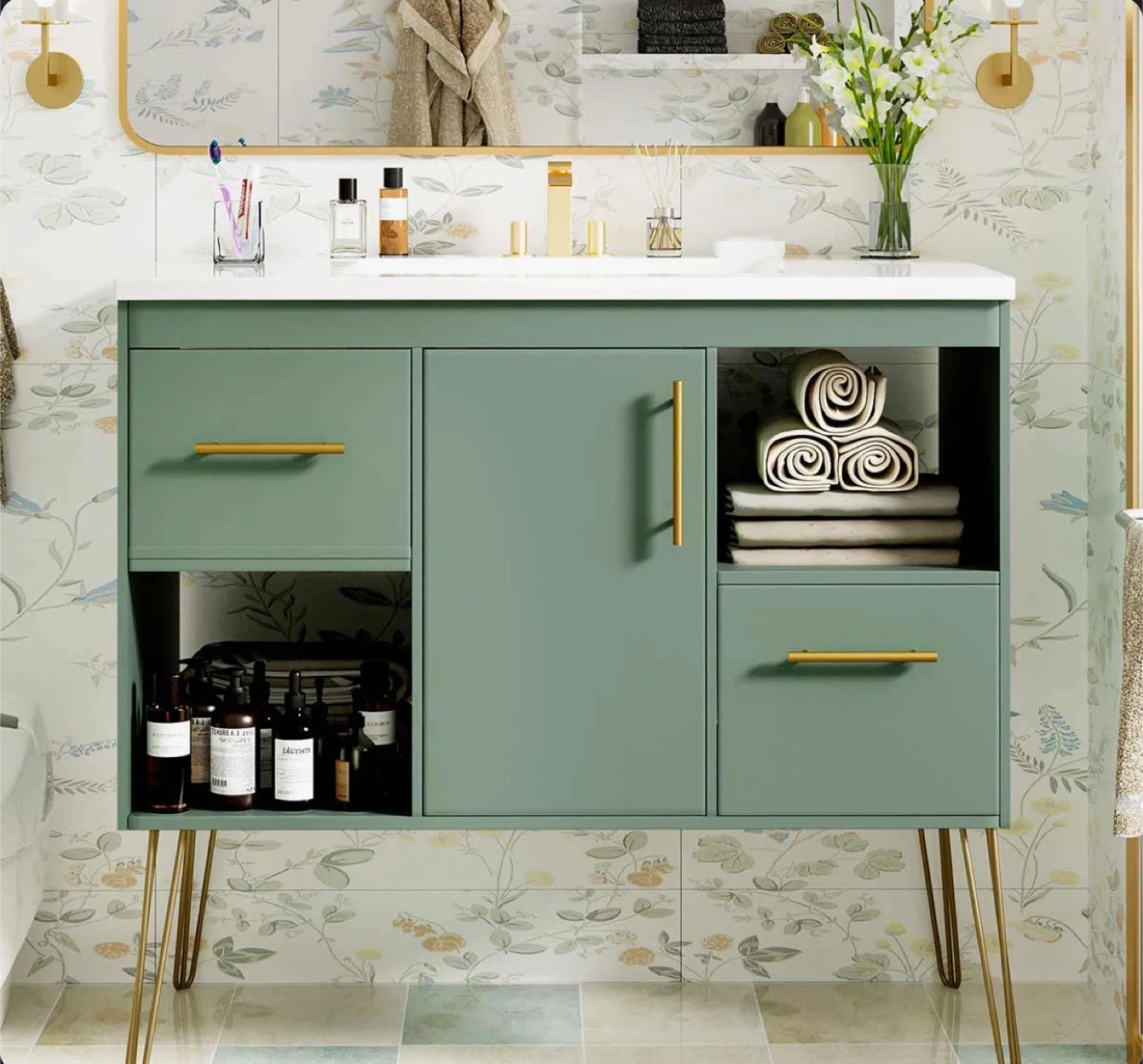 This 36-inch bathroom vanity features a resin sink combo. It includes two drawers and a cabinet with shelving for ample storage. The unit is made of durable materials and stands on stylish gold hairpin legs. Its modern design fits well in most bathrooms.