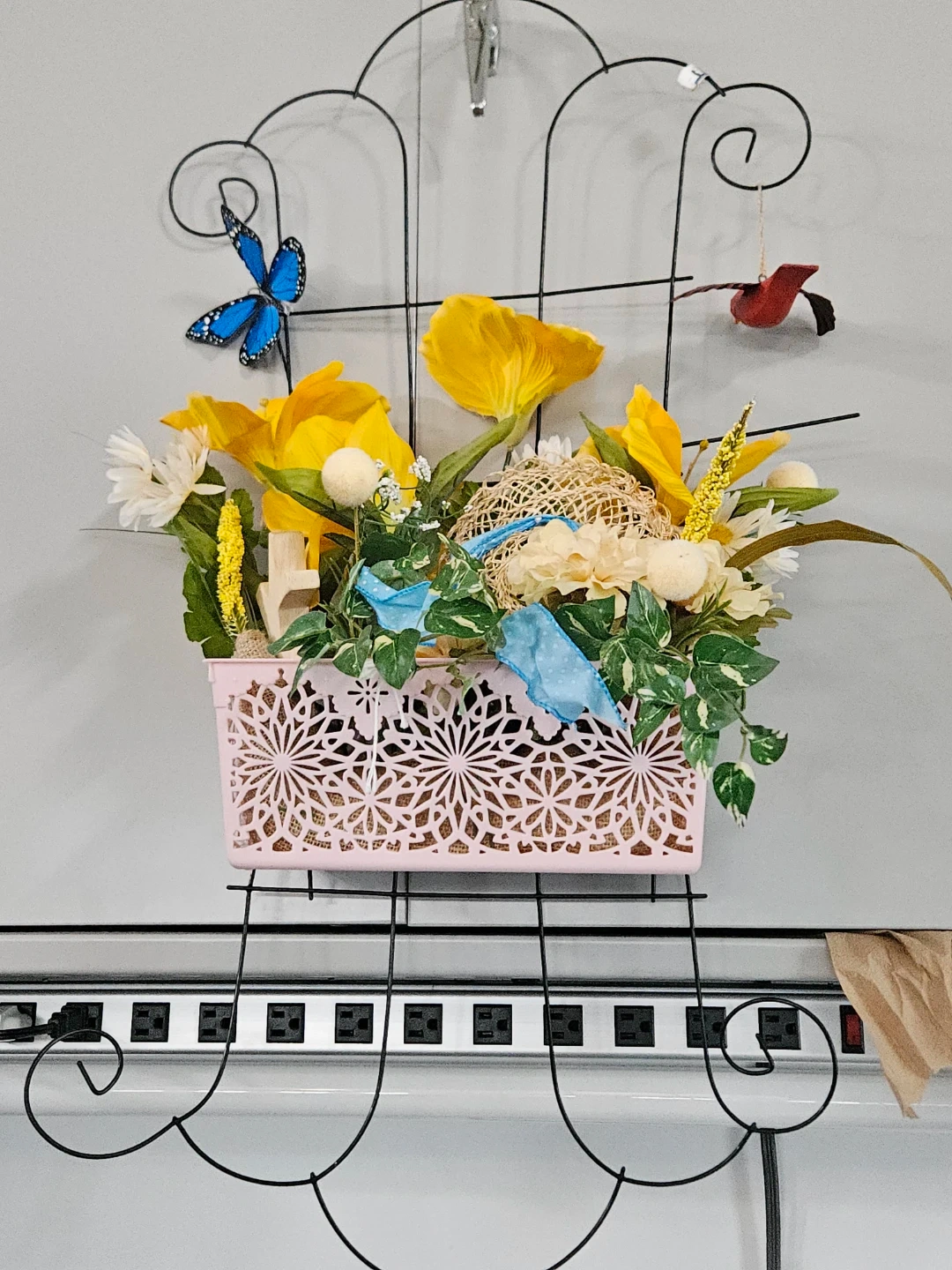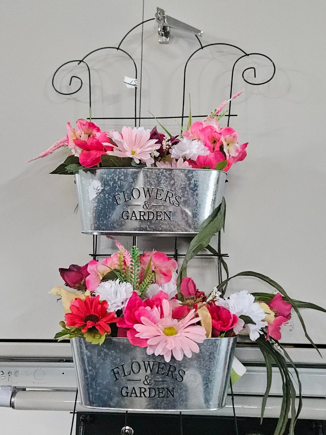 Two decorative wall hangings featuring artificial flowers in metal buckets and a pink basket. Includes butterflies and bird ornaments. Adds a touch of spring to any wall!