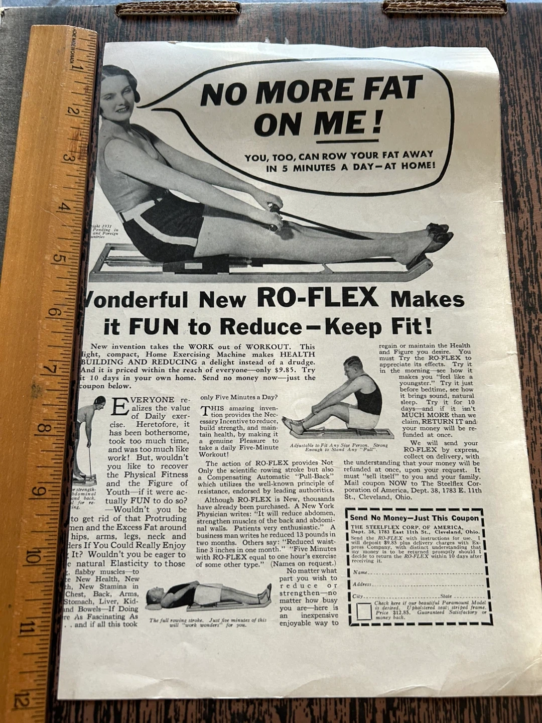 1930 antique ad "no more fat on me" health weight & Kellogg's Pep Bran Flakes Cereal PRINT AD Vintage ad 1930 Double sided page Original antique paper ephemera Health rowing machine weight loss 15.00 Flexible re pickup Elmsdale Road M4J 3M3 Donlands O'Connor East York Don Mills south exit off DVP