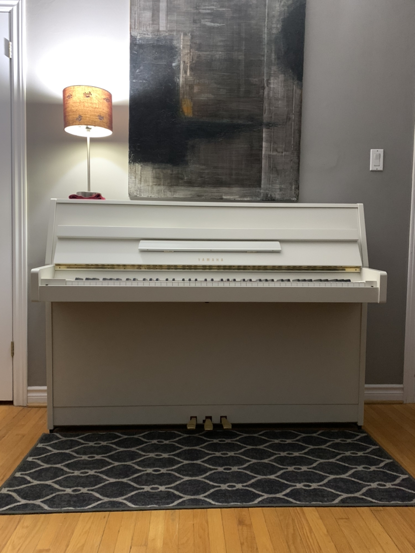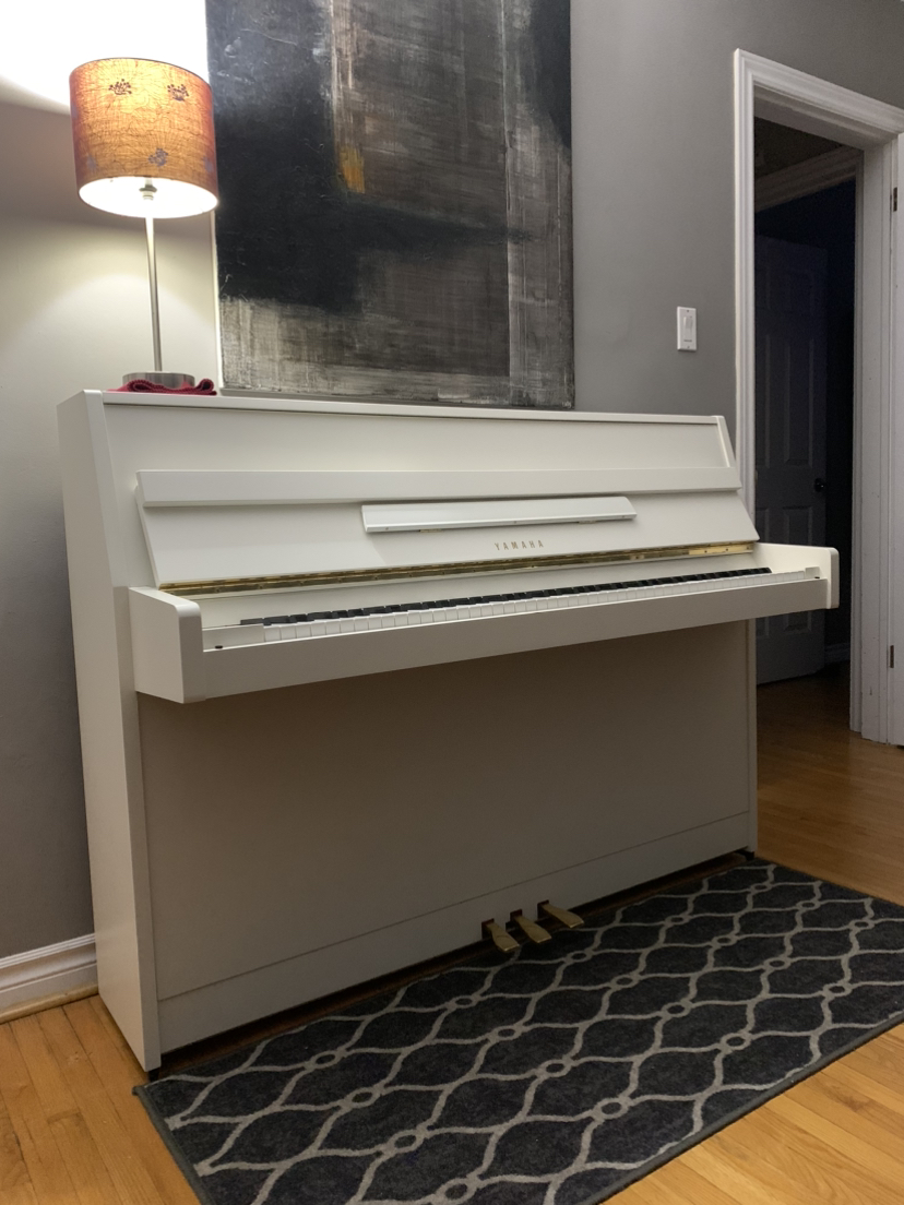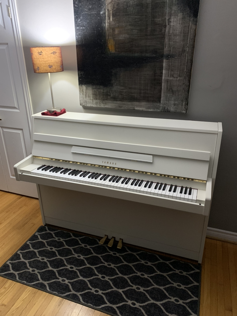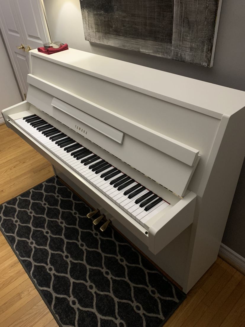 23Yamaha upright Piano Model-C108 made in Japan , high-43” width-58” This beautiful Yamaha model features a gorgeous white satin finish with the full 88 notes keyboard and a third or Celeste pedal that softens the notes to be played quietly at anytime , it is one of the most popular choices for small modern pianos owing to its compact size and built quality. Very popular choice for students of any level, small studio or those looking for something with a bit more class than your typical starter piano Recently tuned and serviced, Professionally detailed inside and out. No dents or scratches, like new condition.. delivery can be arrange (Subject to location) Bench is included.