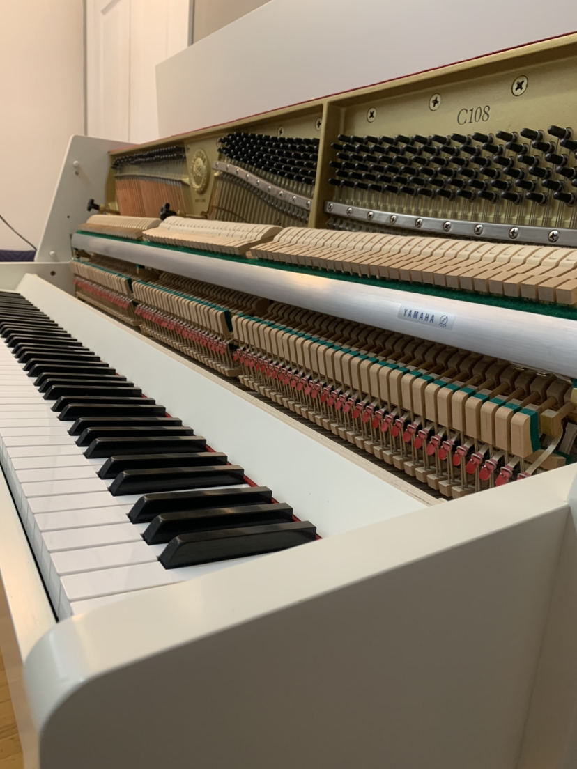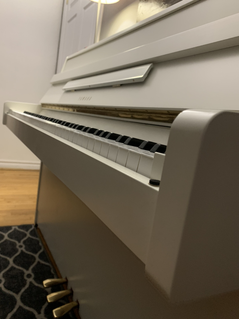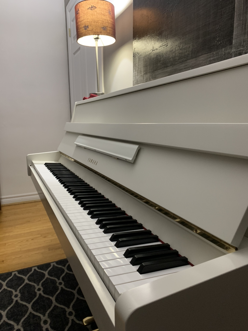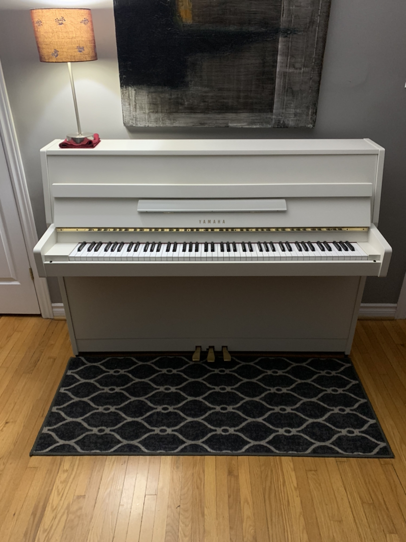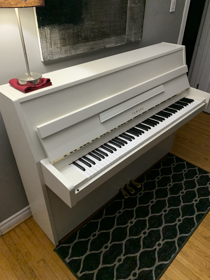 23Yamaha upright Piano Model-C108 made in Japan , high-43” width-58” This beautiful Yamaha model features a gorgeous white satin finish with the full 88 notes keyboard and a third or Celeste pedal that softens the notes to be played quietly at anytime , it is one of the most popular choices for small modern pianos owing to its compact size and built quality. Very popular choice for students of any level, small studio or those looking for something with a bit more class than your typical starter piano Recently tuned and serviced, Professionally detailed inside and out. No dents or scratches, like new condition.. delivery can be arrange (Subject to location) Bench is included.