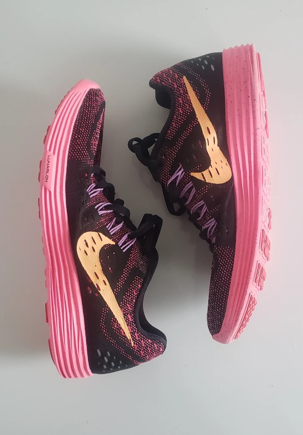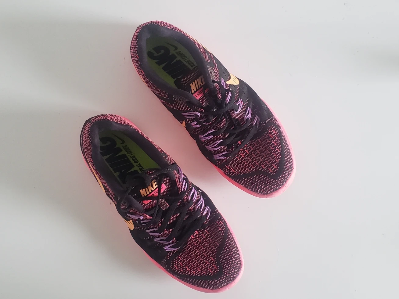 used once, too tight for my feet but thought Id circle back to them. ended up just getting wider addidas kicks. beautiful hot pink speckled lunar sole and breathable "flyknit" stretch material. size 7.