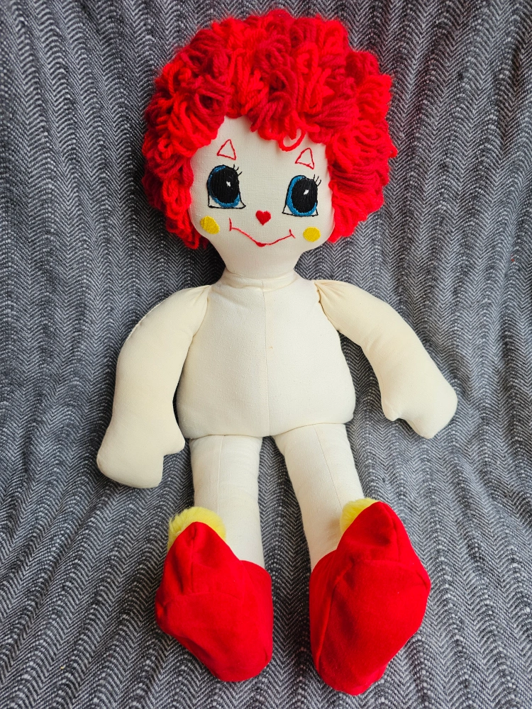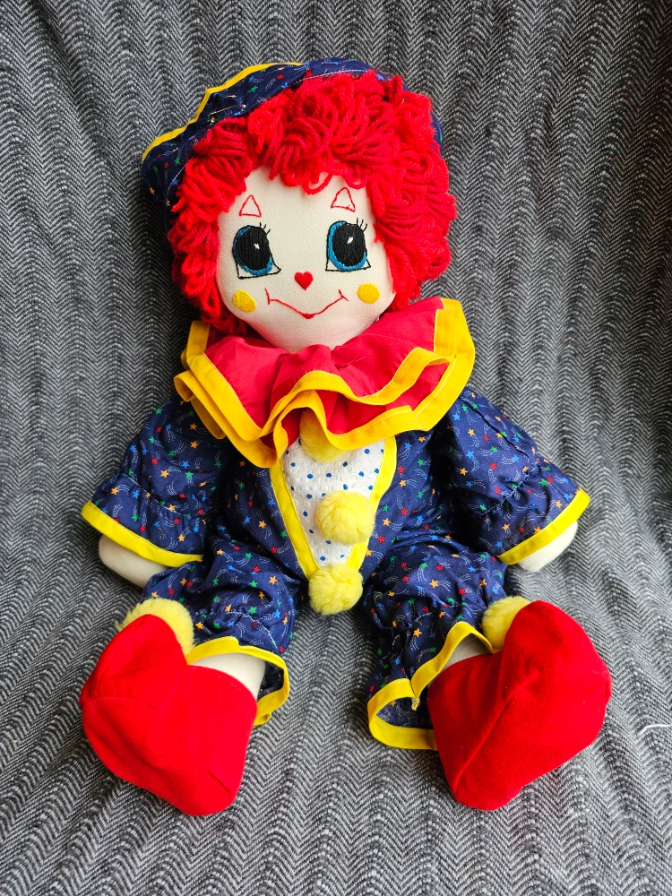 This sweet clown is looking for a forever home where she will be loved and cherish! Her beautiful face is hand stitched 🪡🧵 Her hat, neck ruffle and clothes all come off for easy care and cleaning! Bring her home today!