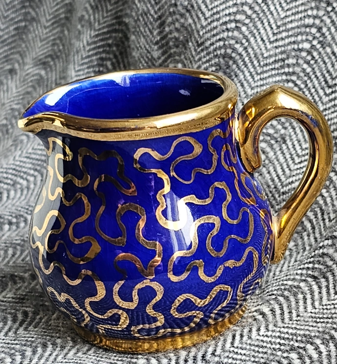 Made in Staffordshire Enlgand in the 1950s, this royal blue cream pitcher has a whimsical hand painted gilded gold squiggle pattern. Beautiful to hold flowers, make up brushes, or any number of things!