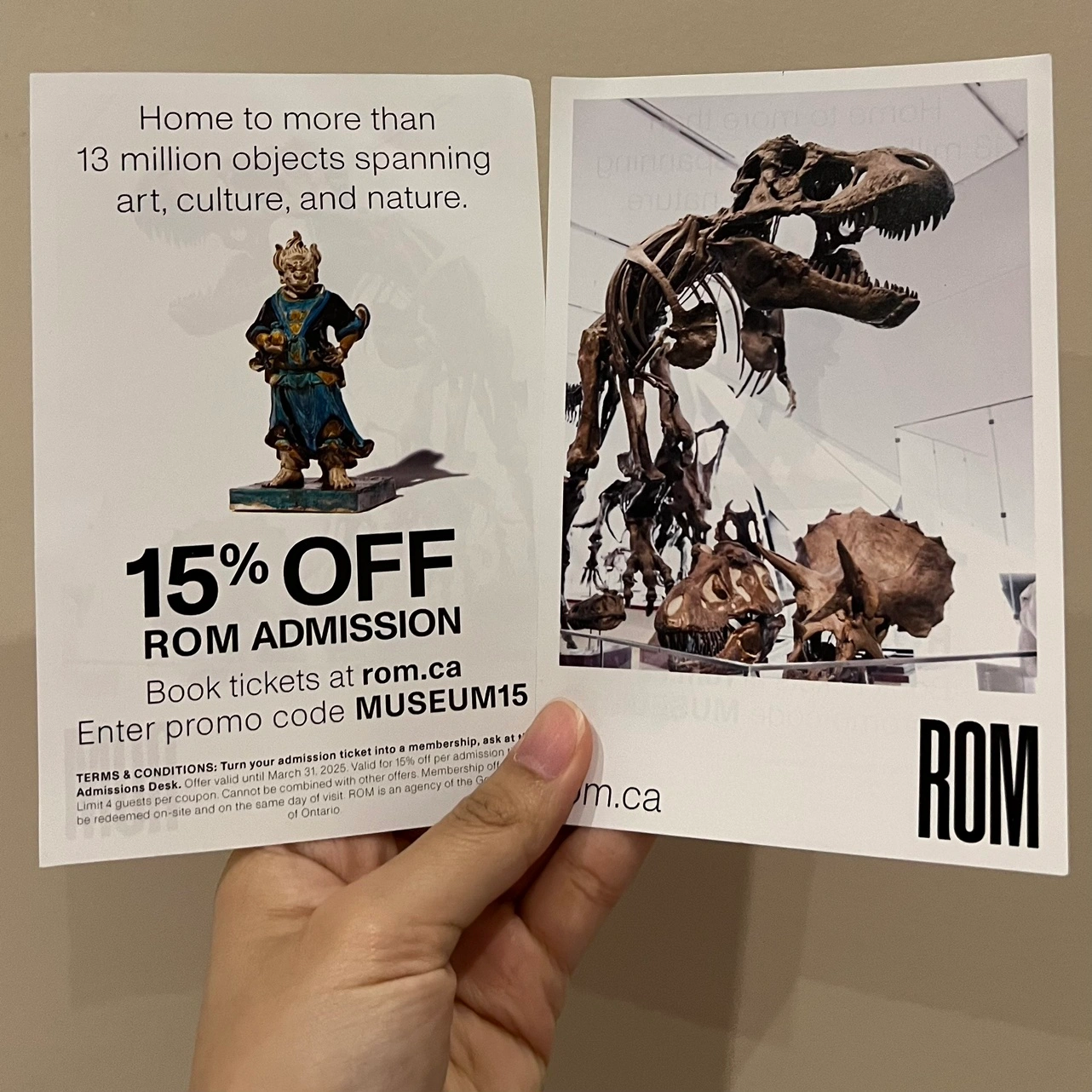 Free, 3 available. Expires 3/31/25. 4 guests per coupon. I’m 1.1km from ROM so they can be picked up before your trip ;)