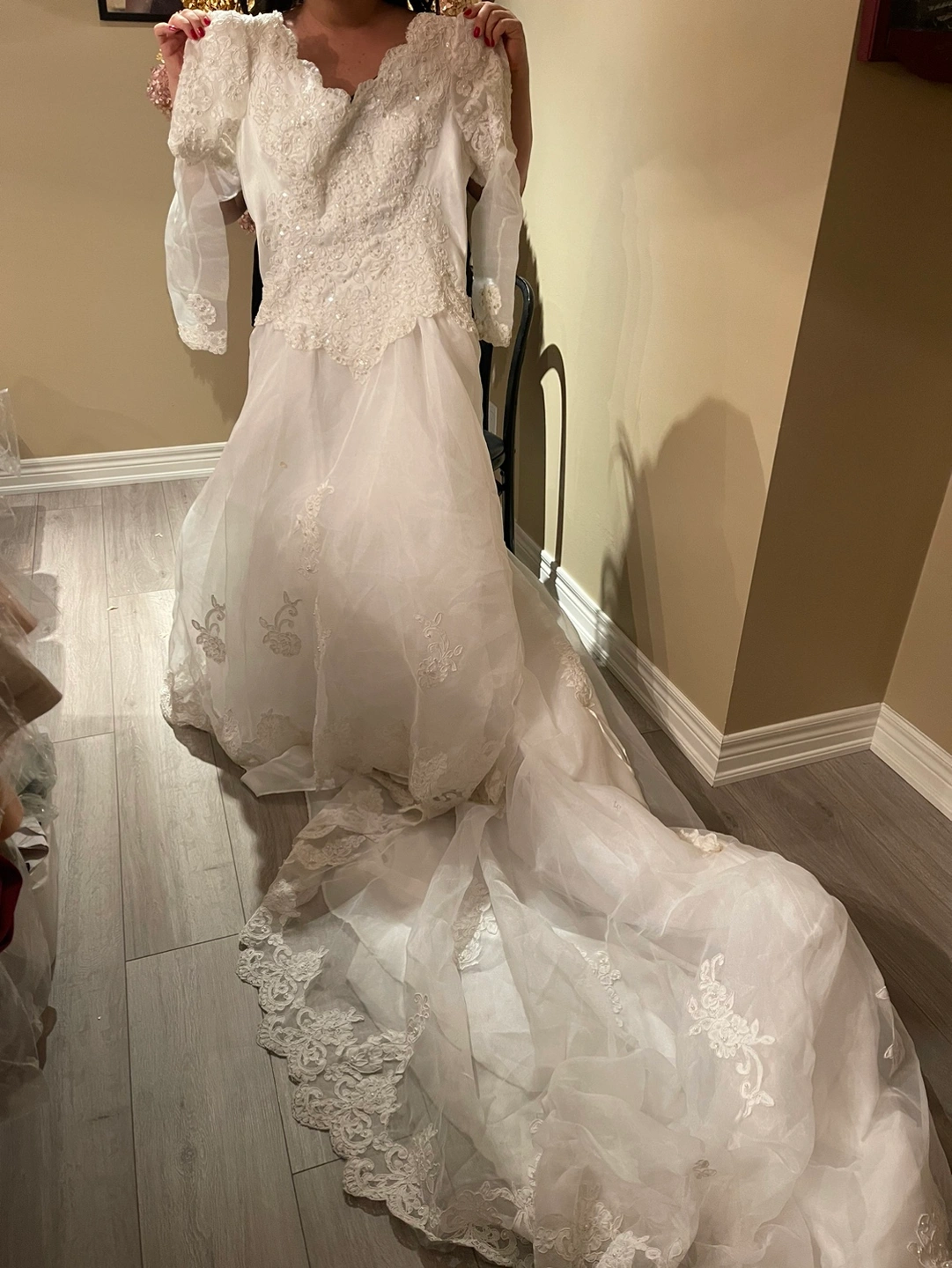 Removable sleeves , long train , lace appliqué , satin material and crystal appliqué