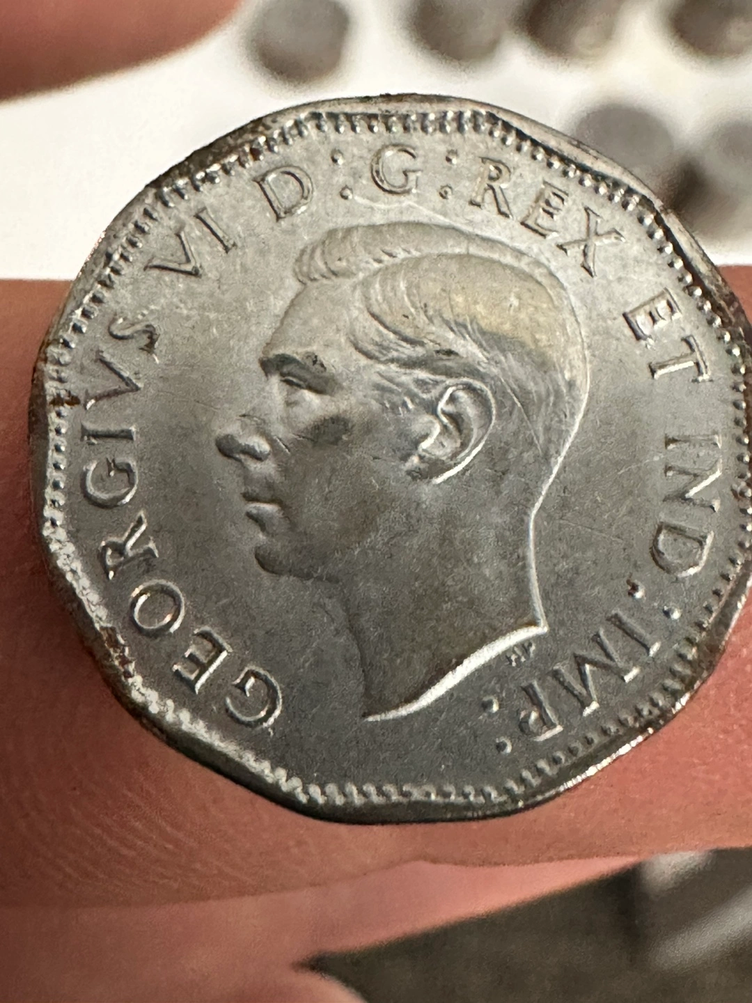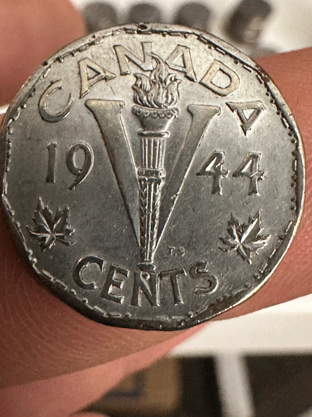 44Vintage Canadian 5-cent coin. Features a V for victory and a torch. King George VI's profile on the other side. Shows some wear.