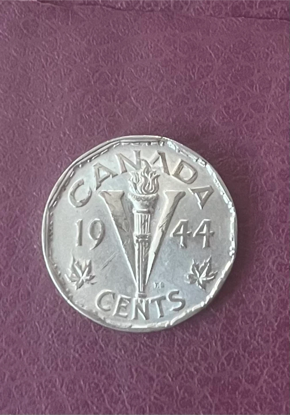 250Selling a Canadian five-cent coin from 1944. It features a 'V' for Victory design with a torch and maple leaves on one side, and King George VI on the other. A piece of Canadian history!