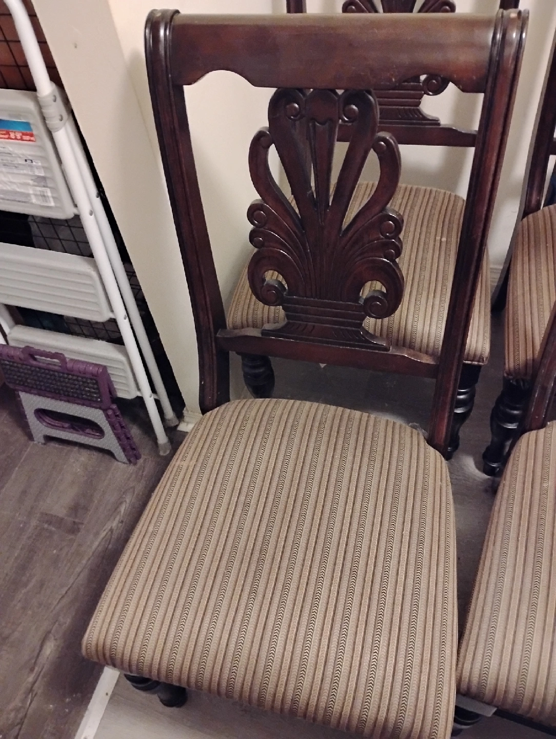 161FOUR WOODEN DINING ROOM CHAIRS. BROWN STRIPED FABRIC ON THE SEATS, IN EXCELLENT CONDITION. I'VE HAD THEM FOR 4 YEARS NEVER USED THEM, TOO BIG FOR MY MORE CASUAL DINING ROOM TABLE. I UPDATED THIS POST WITH NEW PHOTOS, WHEN I TOOK THE ORIGINAL PHOTO THERE WAS ONLY ONE SEAT THAT HAD A SLIGHT MARK, ALL OF THEM SHOW SLIGHT MARKS NOW BUT I'M NOT SURE IF THAT'S FROM A FOOD STAIN, OR A MARK FROM HAVING TWO OF THE CHAIRS UPSIDE DOWN ON THE OTHER TWO. THESE ARE EXACTLY HOW I BOUGHT THEM, AS I HAVE NEVER USED THEM.