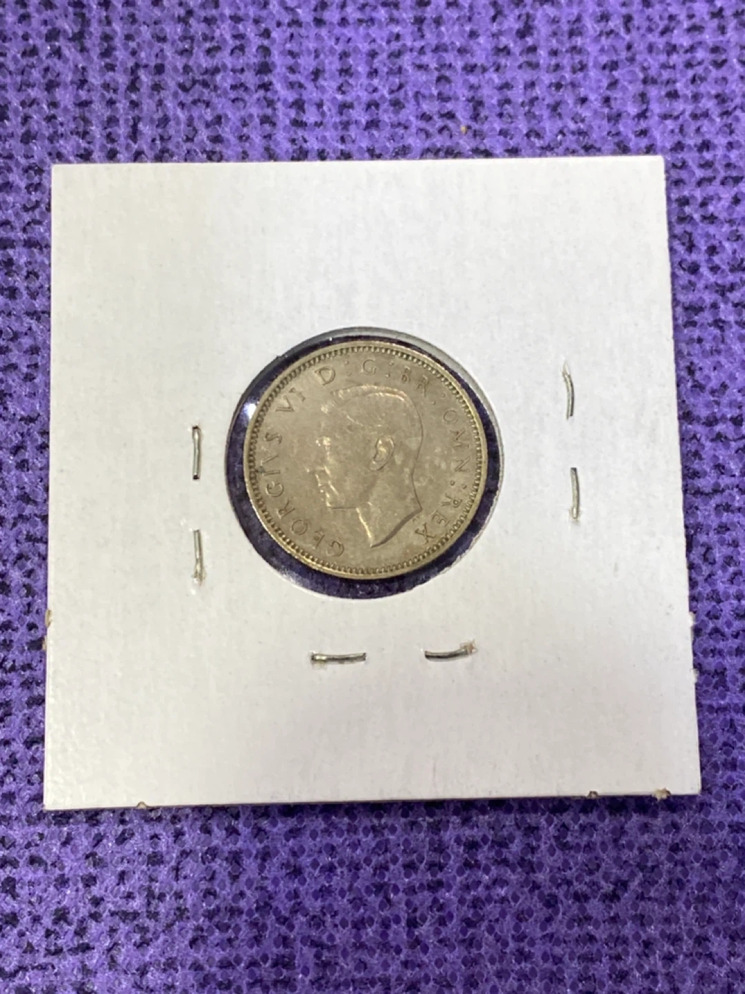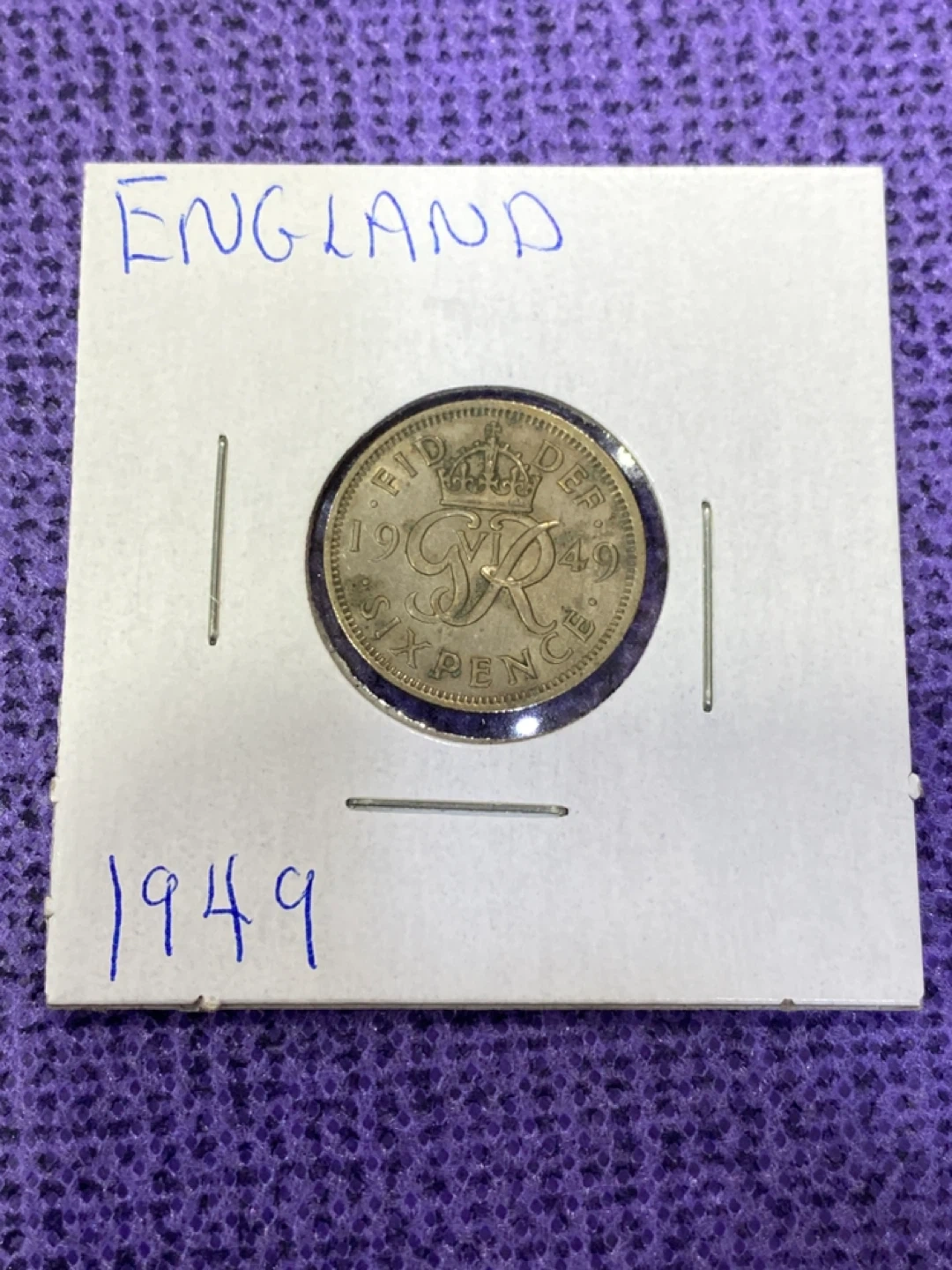 Selling a 1949 England Sixpence coin. The coin is mounted on a card with "England" and "1949" handwritten on it. A great piece for collectors!