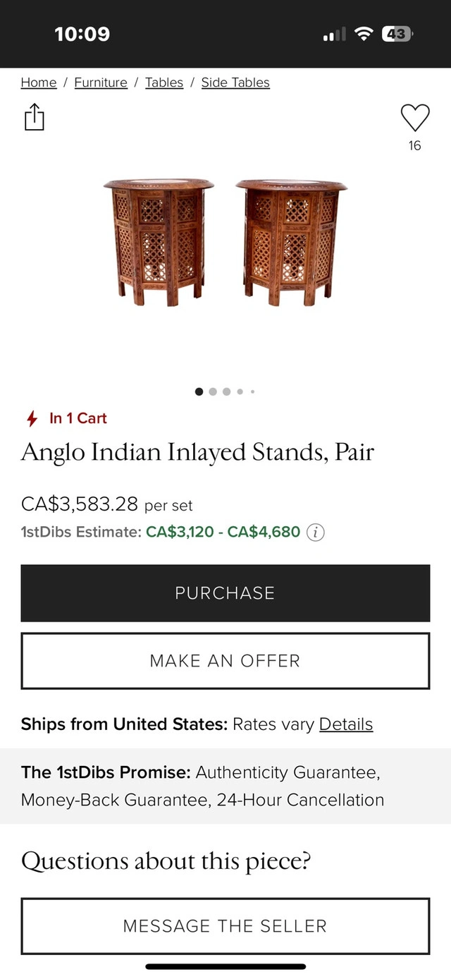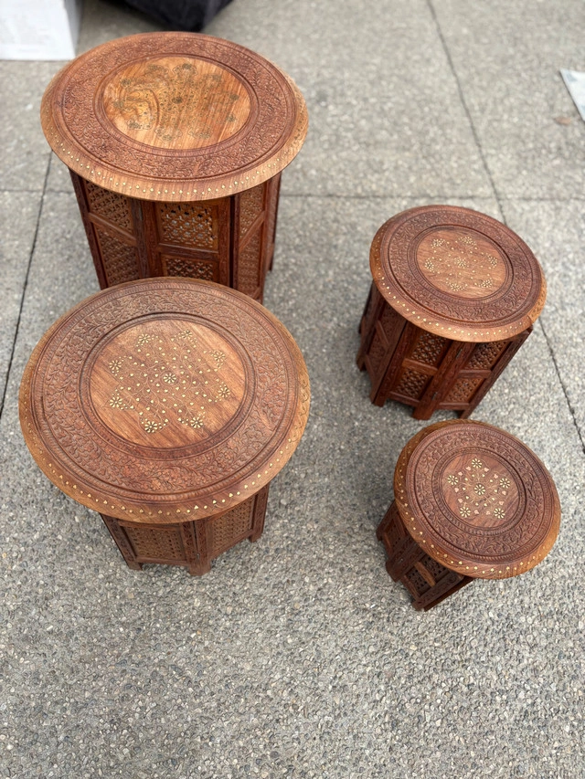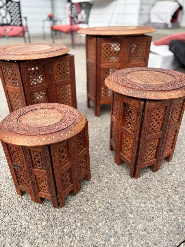 1950s Anglo-Indian Octagonal finely hand Carved Teak Side Table with intricate Brass Inlays in the center top and around the top. Table is collapsible, making it a great space saver. Table measures 18" in diametr and stands please contact for price
