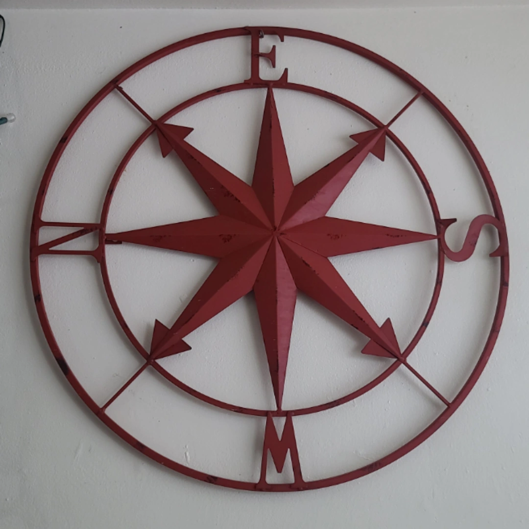 Red distressed compass rose. Great as wall decor, especially for a cottage. Made of metal but nice and light.