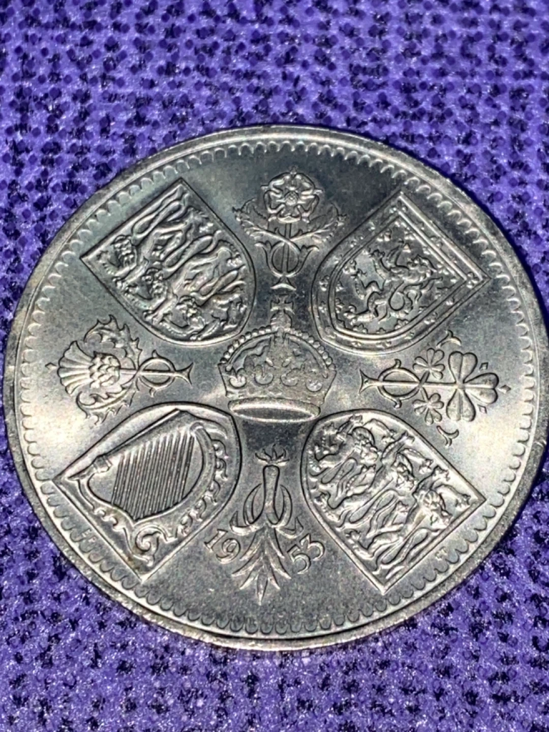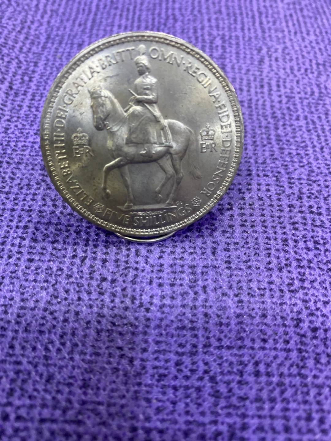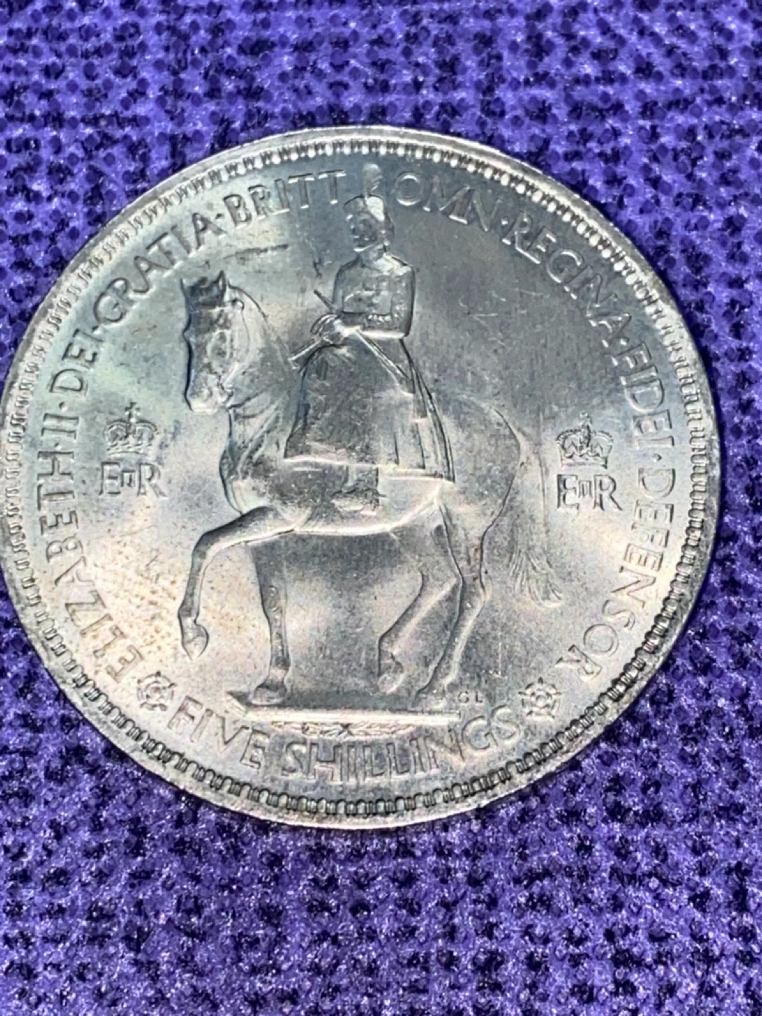 Offering a 1953 Elizabeth II Five Shillings coin. It features a portrait of Queen Elizabeth II on horseback on one side and a design with shields and emblems on the other. A unique piece for collectors!