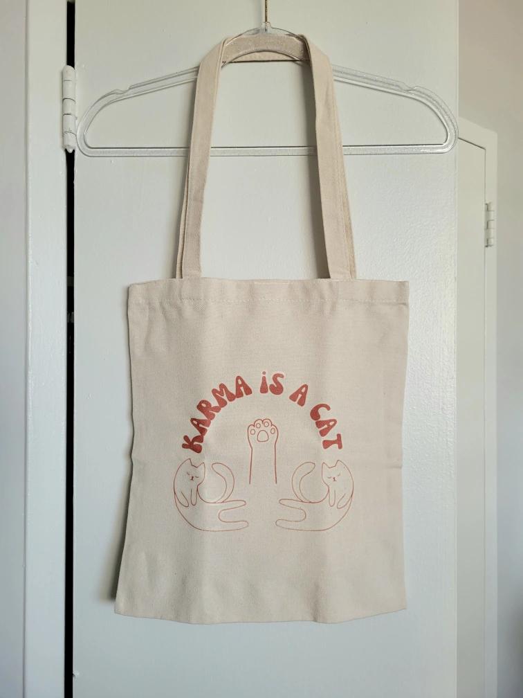 New and unused tote bag with cat print and the phrase "KARMA IS A CAT" across the top. Perfect for someone who is a fan of Taylor Swift and/or cats!