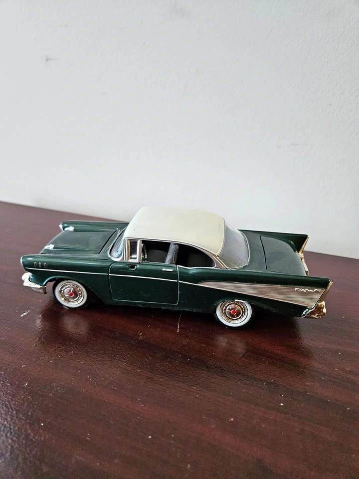 This 1957 Chevrolet Bel Air 1:24 die-cast model features a deep green body with a cream roof — a refined take on the beloved American classic. The detailed chrome accents and iconic tailfins make it a standout collectible for any vintage car fan. Brand: Chevrolet Model: Bel Air (1957) Scale: 1:24