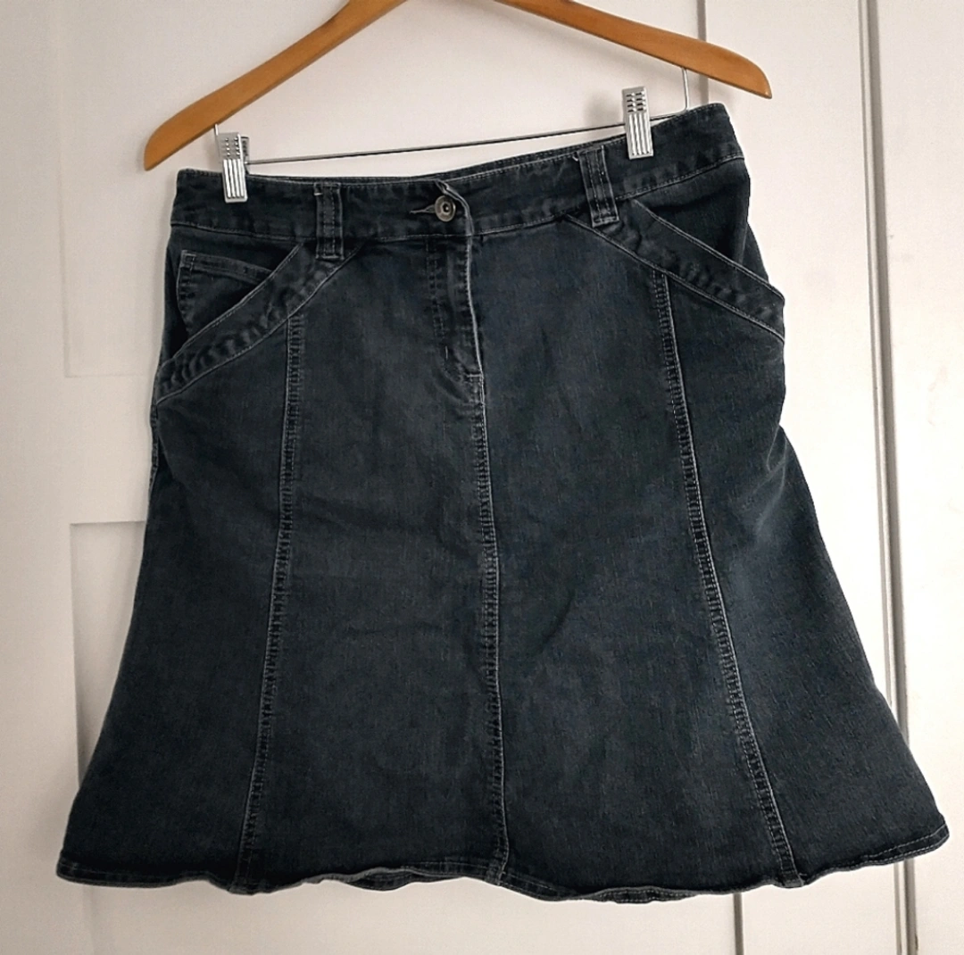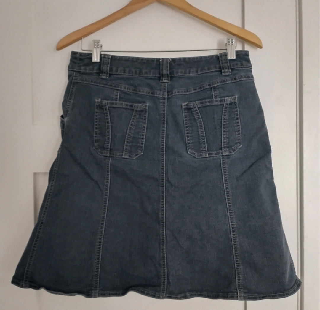 Comfortable blue jeans skirt size 10 with some stretch. Good used condition. No visible flaws. Five pockets!