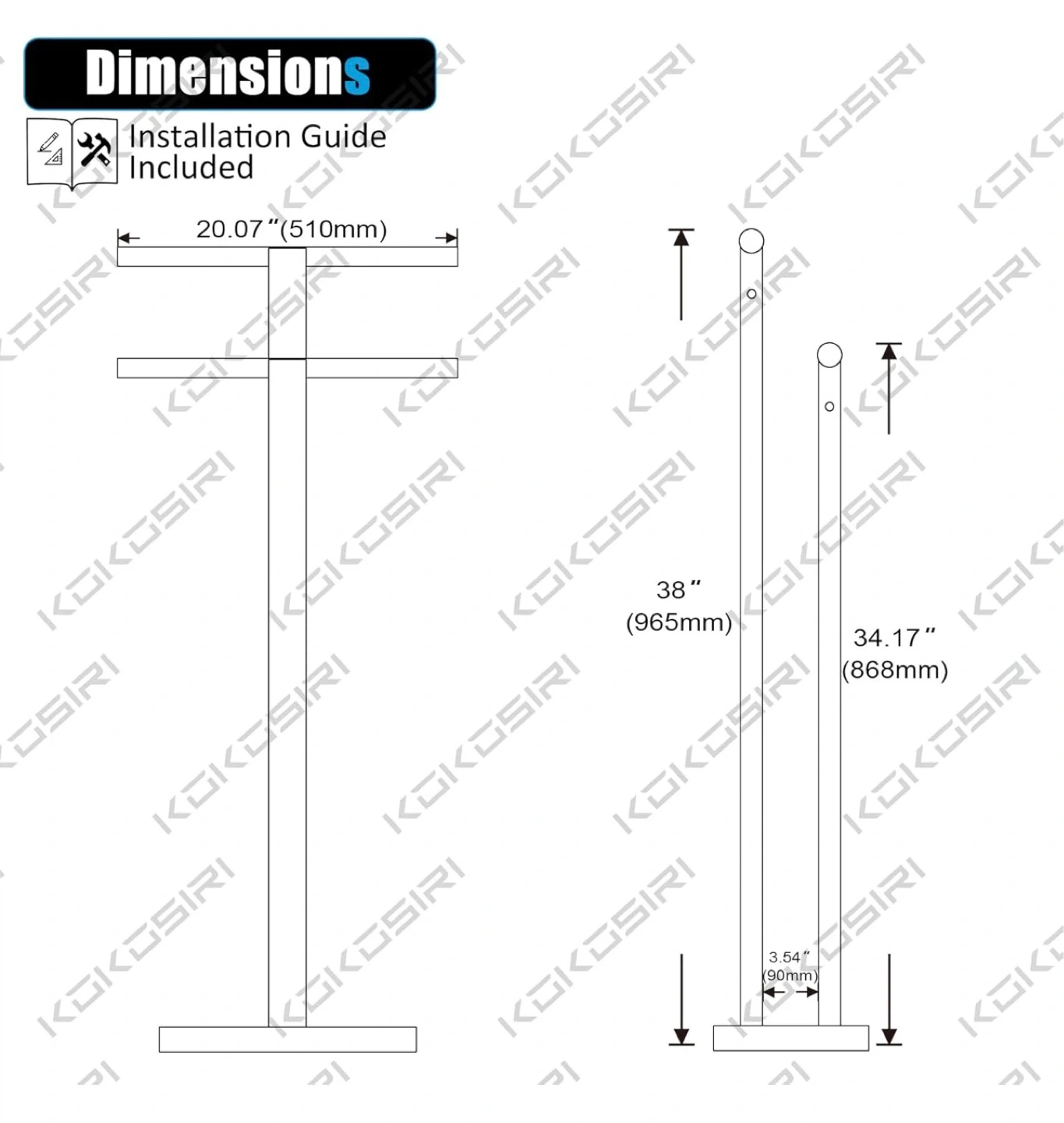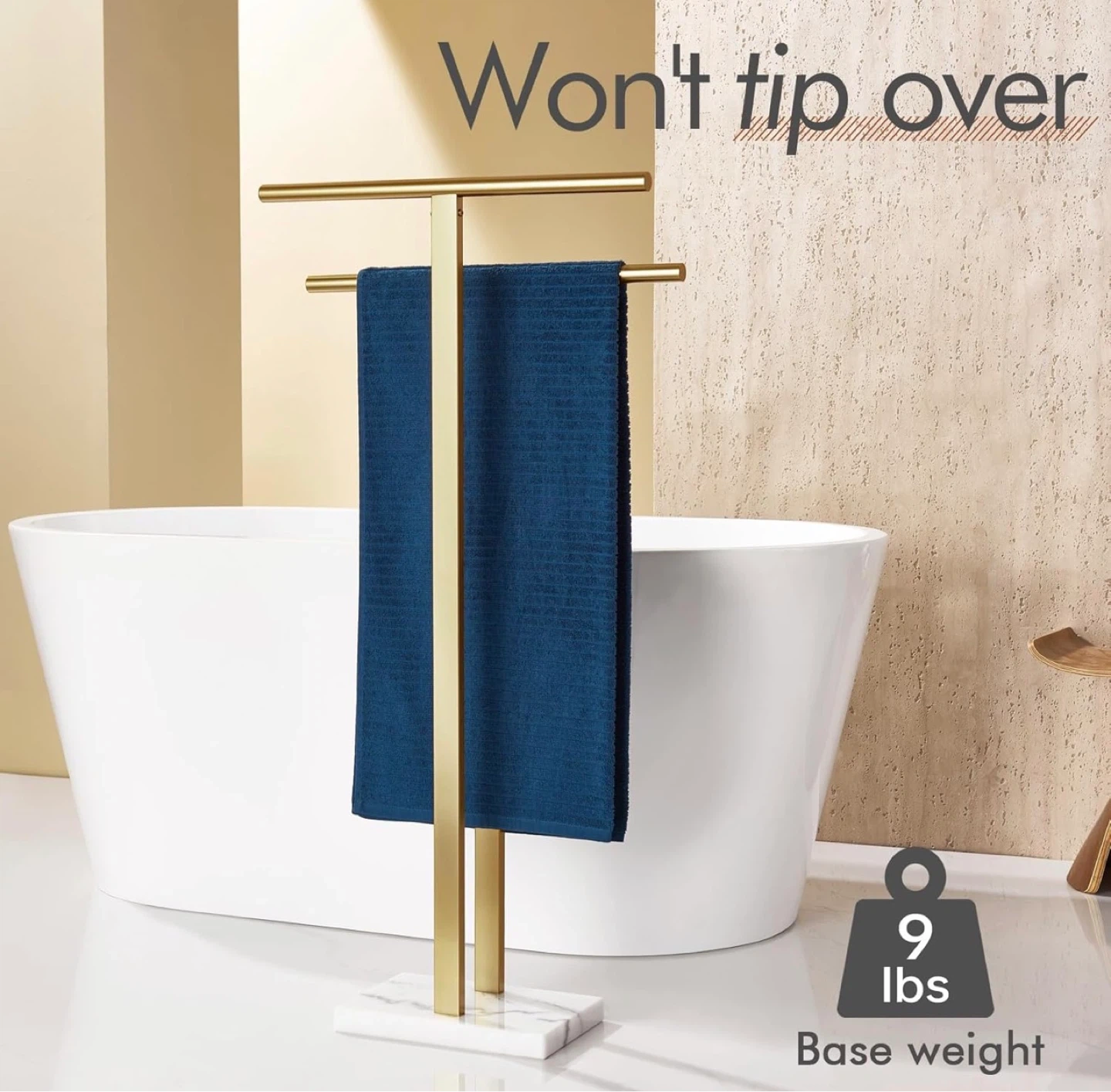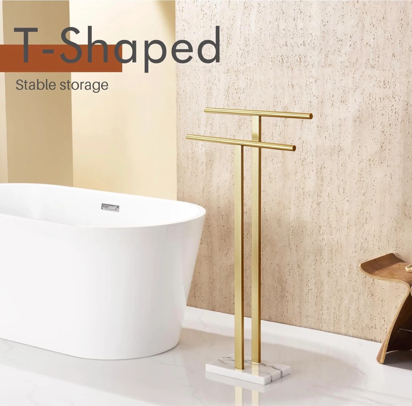 This freestanding towel rack features a "T-shaped" design with two bars for hanging towels. It has a stable base with a 9 lbs weight. The gold finish and marble-look base add a stylish touch to any bathroom. It's designed to be stable and won't tip over!