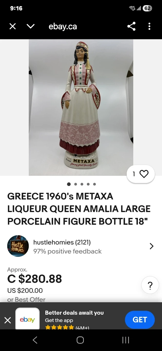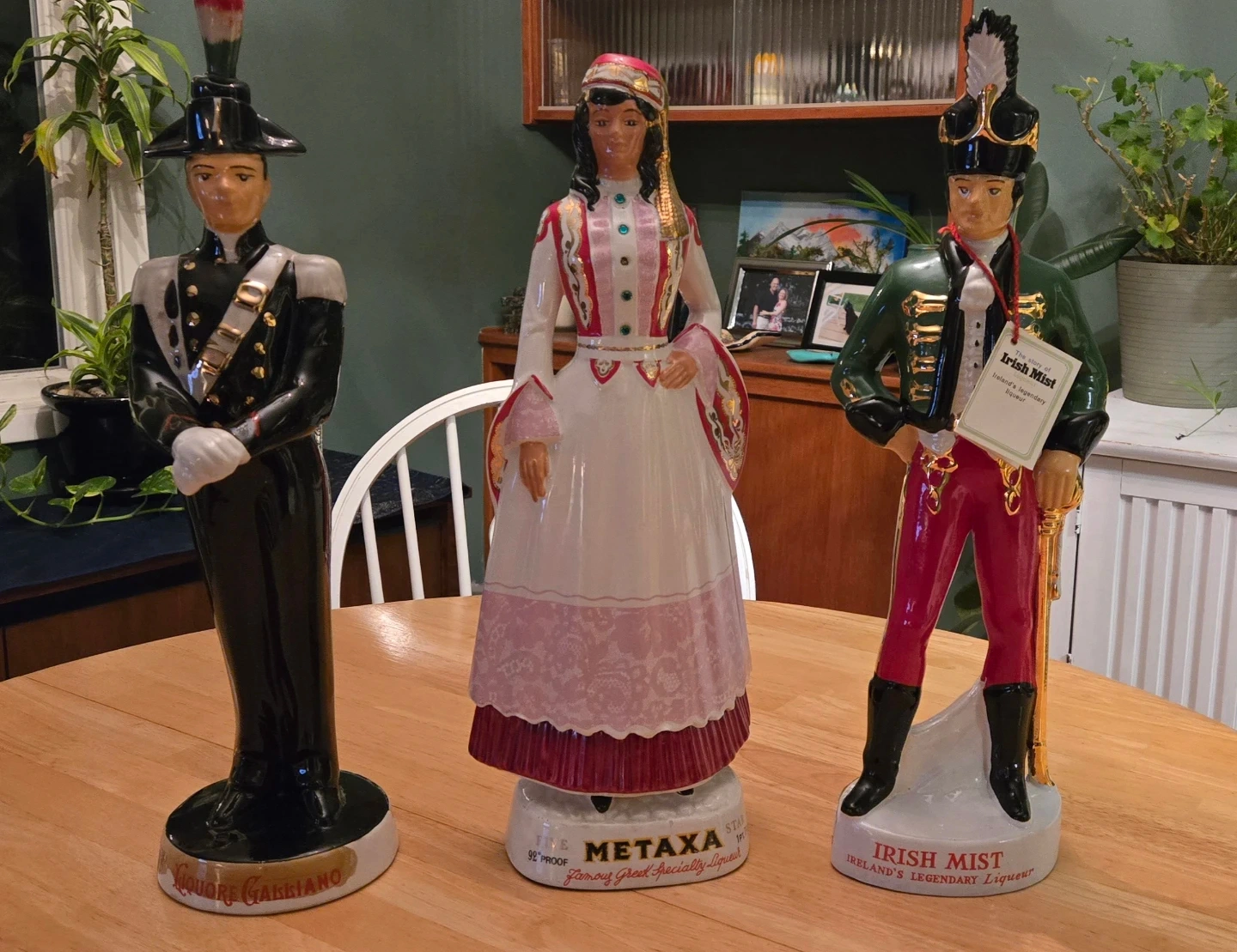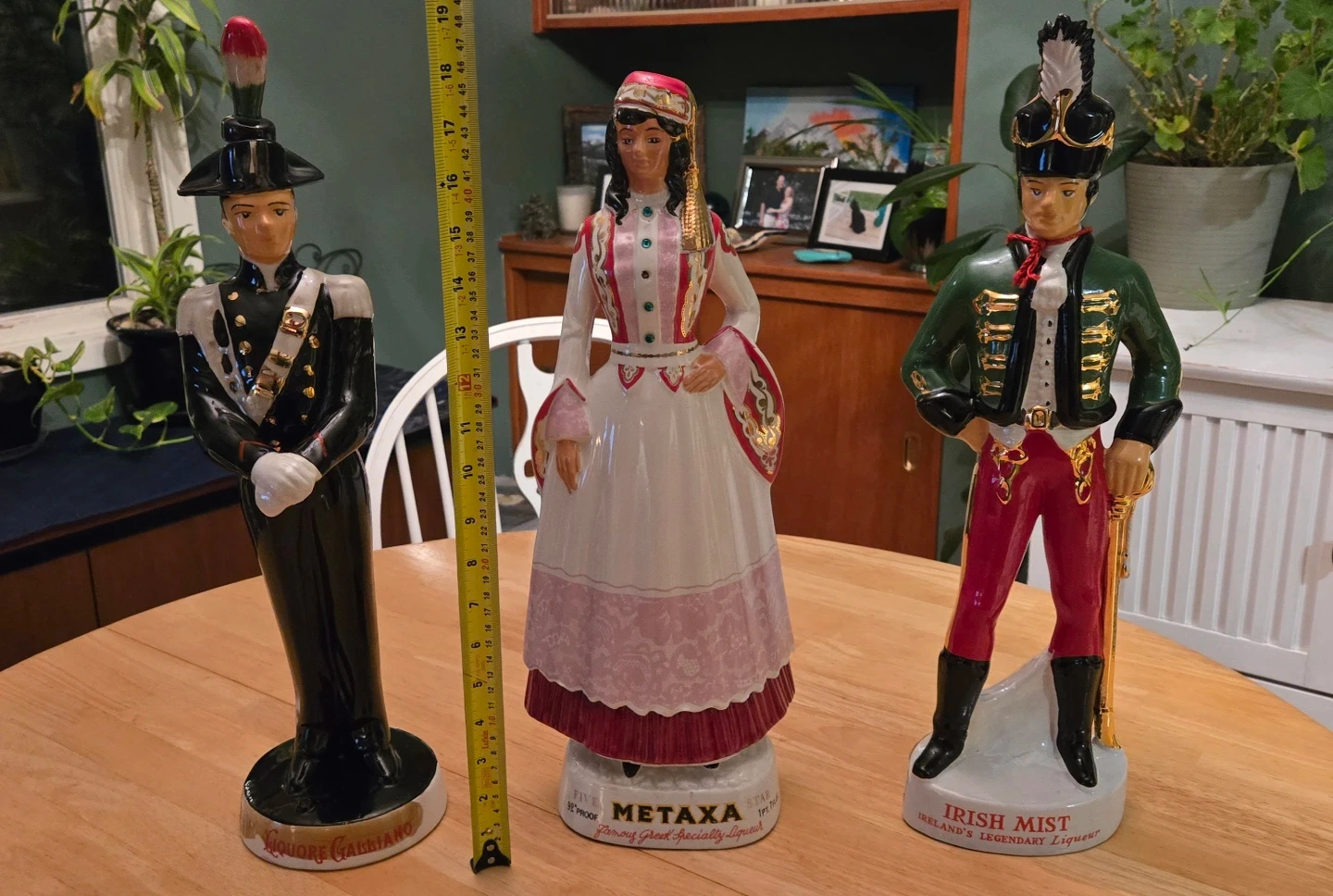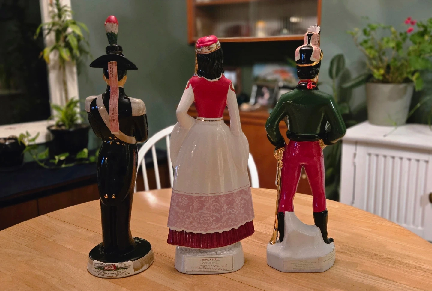 87Colourful, handpainted liquor bottles dating back to the 1960's. They're in good condition. No chips or cracks, however the soldiers have some discoloration near or beneath the base, possibly from the alcohol that was in them? The lady is in excellent condition, but is missing one tiny green gemstone button from her dress, and the cork that fits into the top of her head. They're quite tall, measuring between 18 and 19 inches in height. All 3 are porcelain, and were made in Italy. Asking $60 for the lady, and $40 for each of the soldiers. Or, if you purchase all three, $100/all. View, or pick up in Glenbrook, SW.