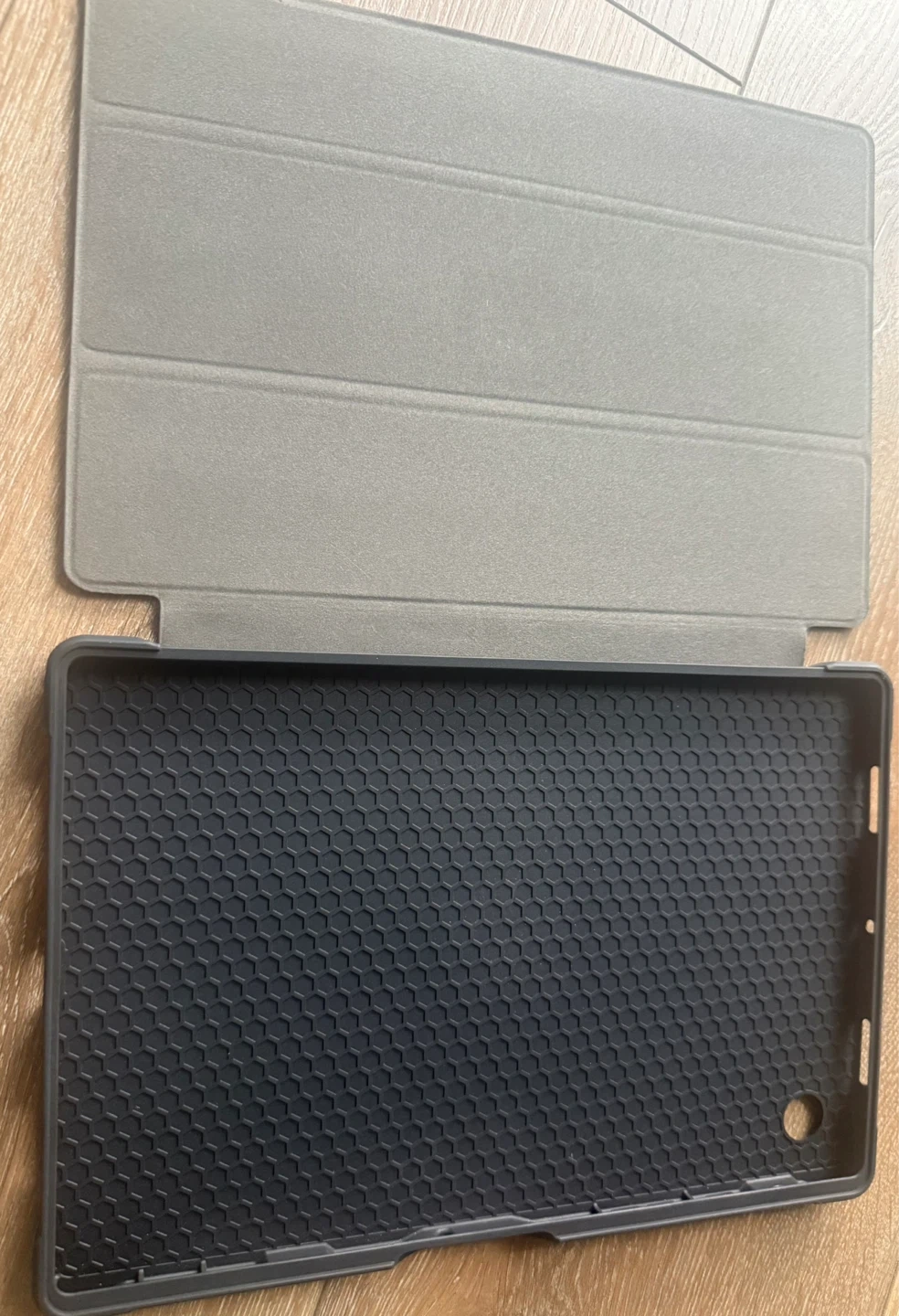 Protective folio case for a tablet. Features a tri-fold design for versatile viewing. Offers durable protection for your device.