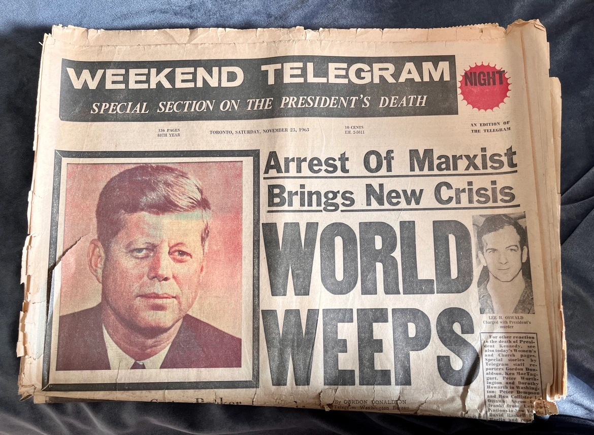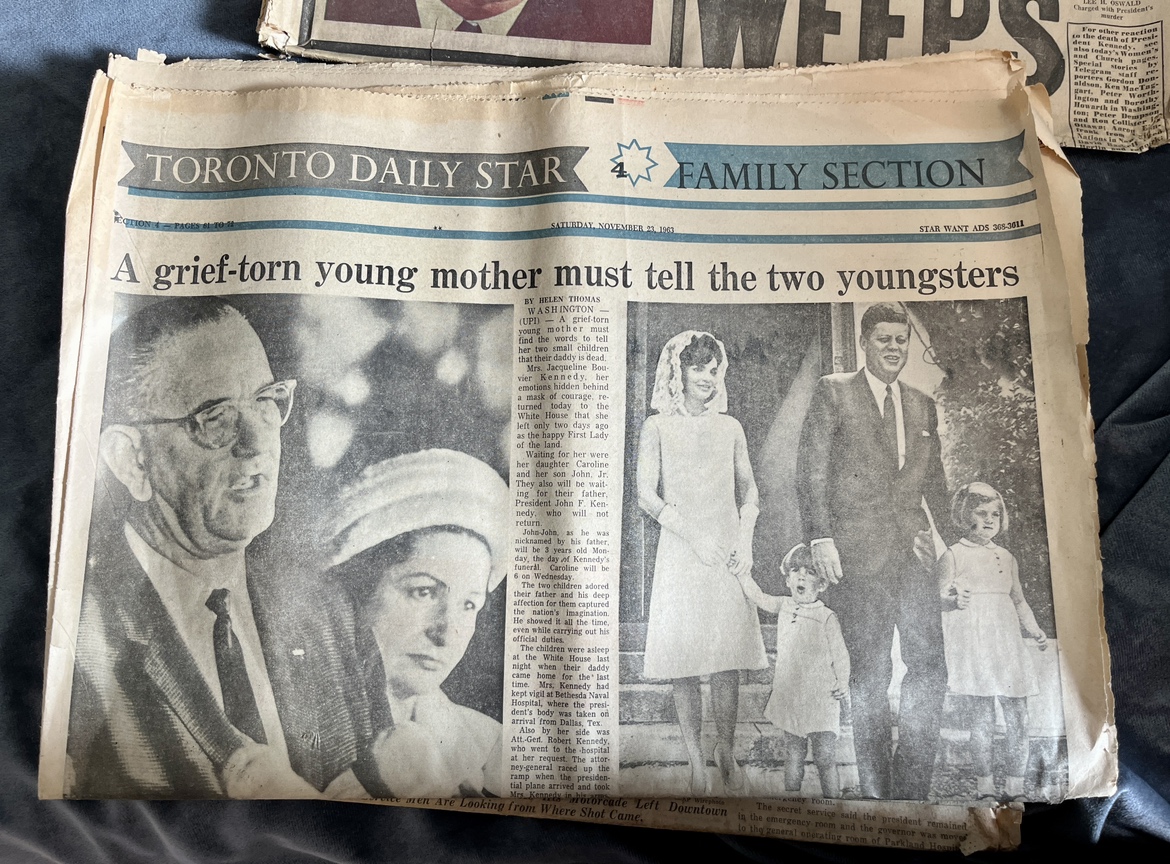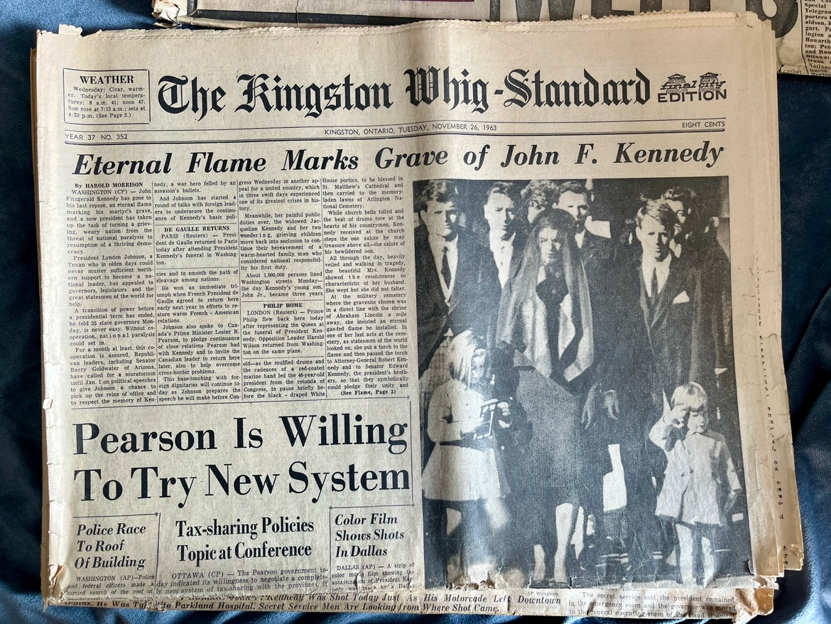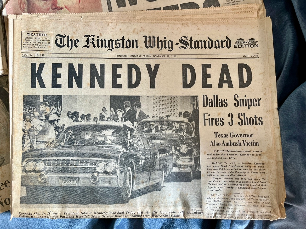 202Some of these newspapers are complete and some are just parts of relevant sections. The lot includes: - Kingston Whig Standard from Nov 22 1963 “Kennedy Dead” - Kingston Whig Standard from Nov 25 1963 “Funeral Held for President Kennedy” - Kingston Whig Standard from Nov 26 1963 “Eternal Flame Marks Grave of John F. Kennedy” - Toronto Daily Star Family Section pages from Nov 23 1963 “A grief-torn young mother must tell the two youngsters” - Weekend Telegram Night from Nov 23 1963 “World Weeps” - John F. Kennedy Memorial Album from 1964 COVER IS MISSING Pickup only. St. Clair West & Spadina Road area.