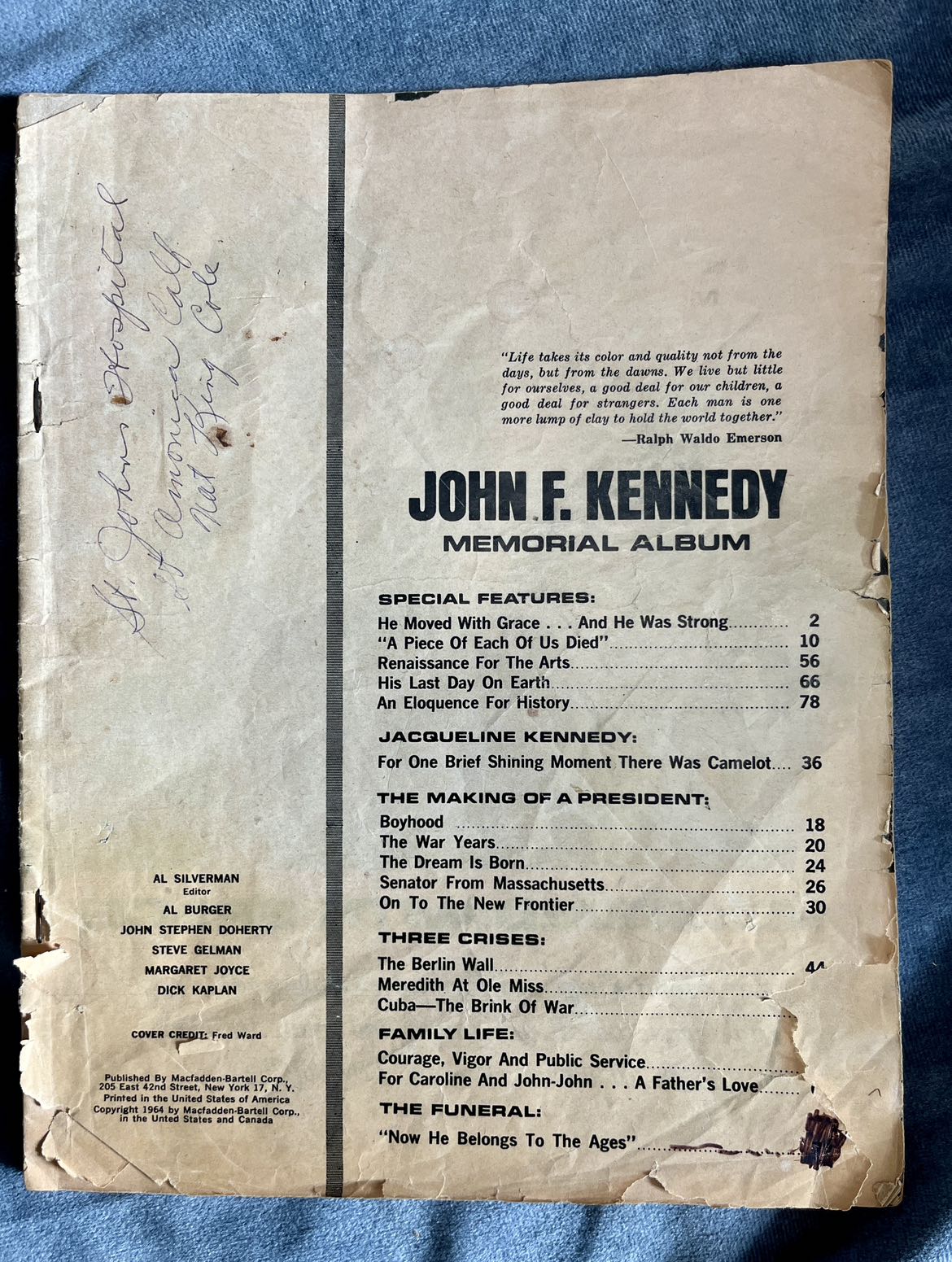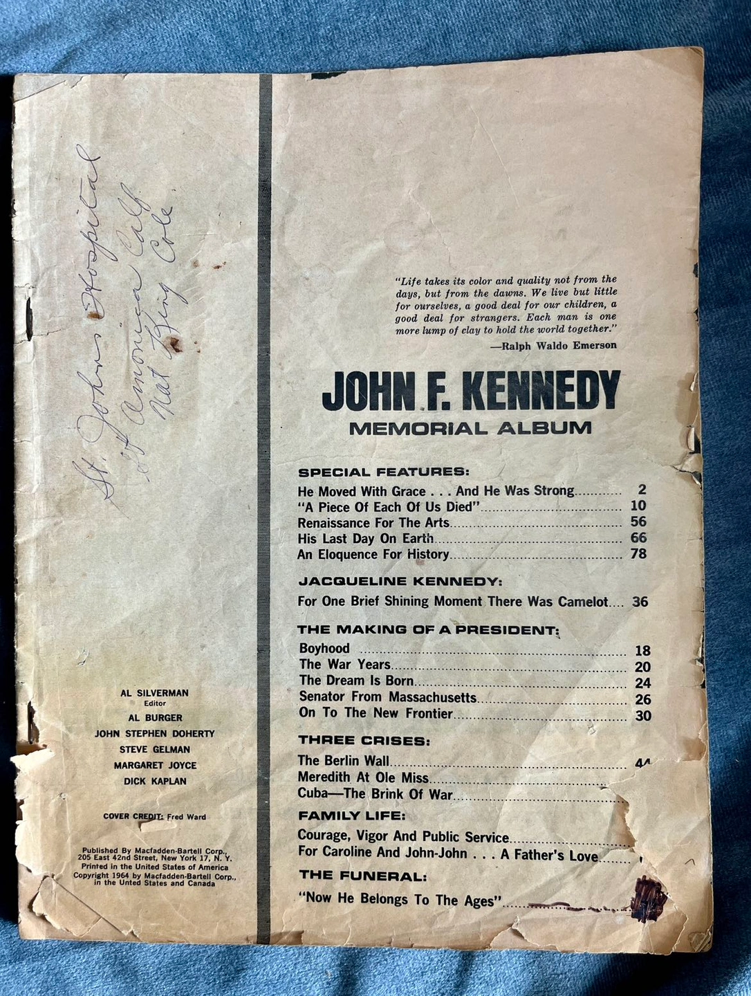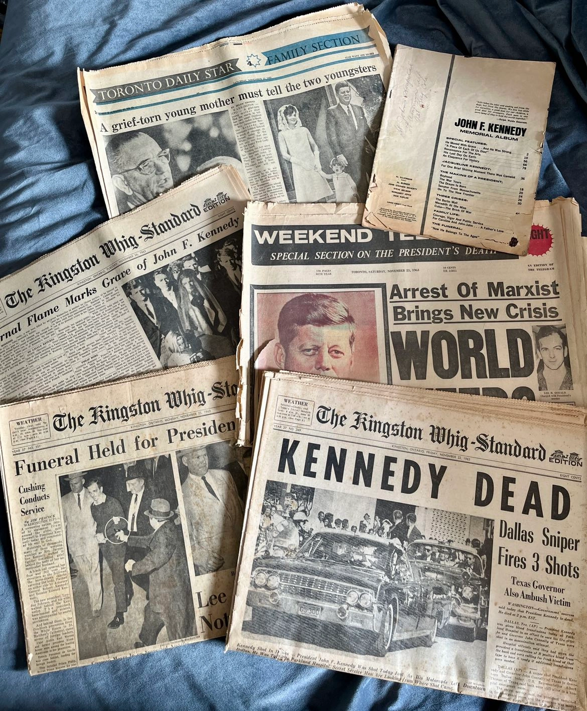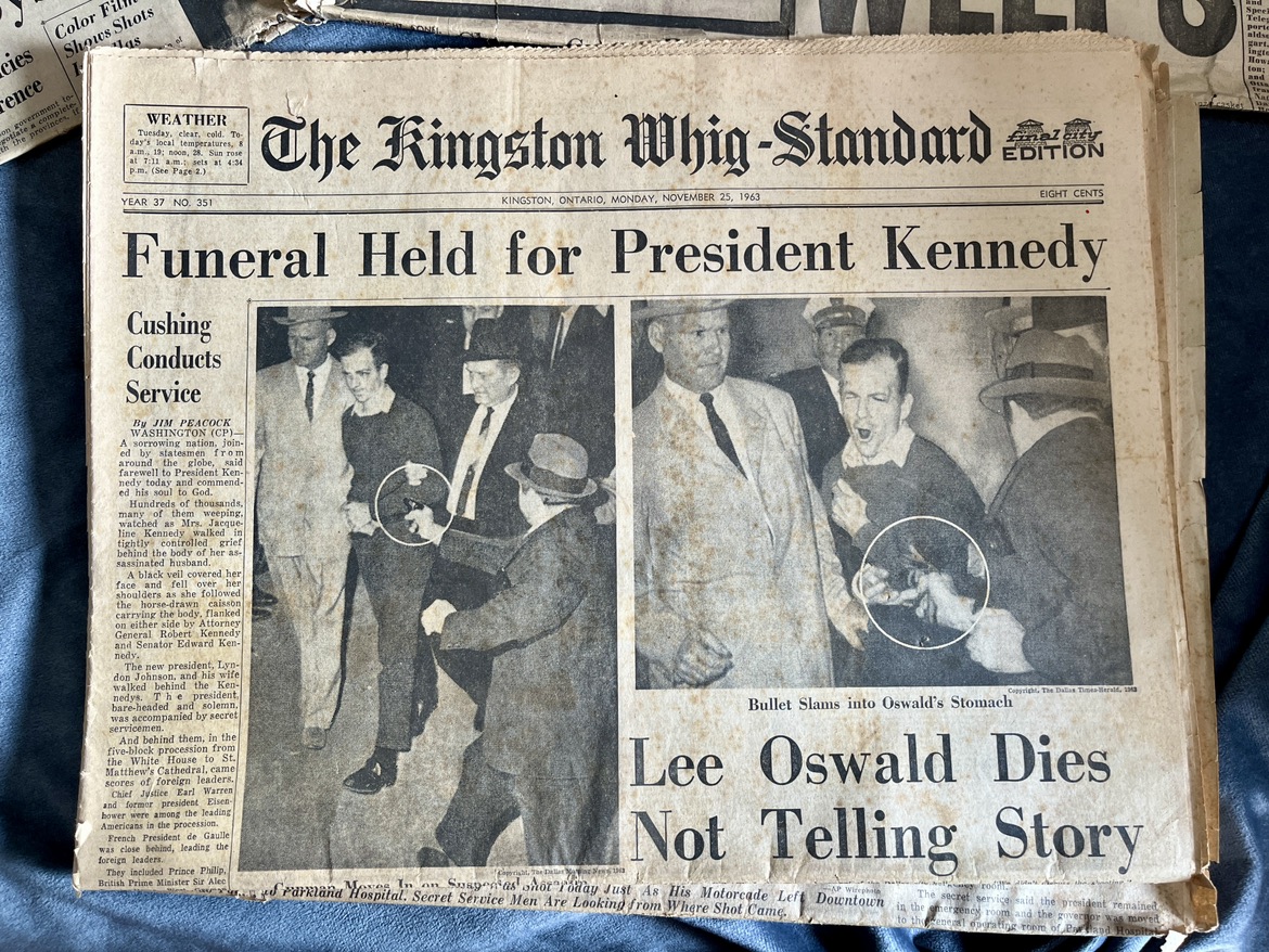 202Some of these newspapers are complete and some are just parts of relevant sections. The lot includes: - Kingston Whig Standard from Nov 22 1963 “Kennedy Dead” - Kingston Whig Standard from Nov 25 1963 “Funeral Held for President Kennedy” - Kingston Whig Standard from Nov 26 1963 “Eternal Flame Marks Grave of John F. Kennedy” - Toronto Daily Star Family Section pages from Nov 23 1963 “A grief-torn young mother must tell the two youngsters” - Weekend Telegram Night from Nov 23 1963 “World Weeps” - John F. Kennedy Memorial Album from 1964 COVER IS MISSING Pickup only. St. Clair West & Spadina Road area.