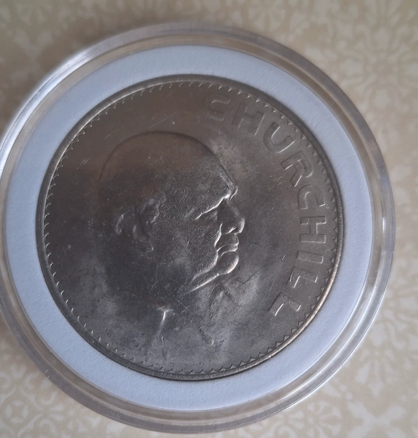 68Selling a 1965 coin featuring Winston Churchill and Queen Elizabeth II.