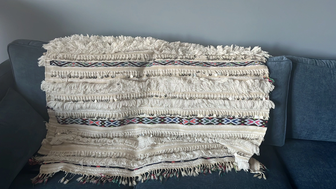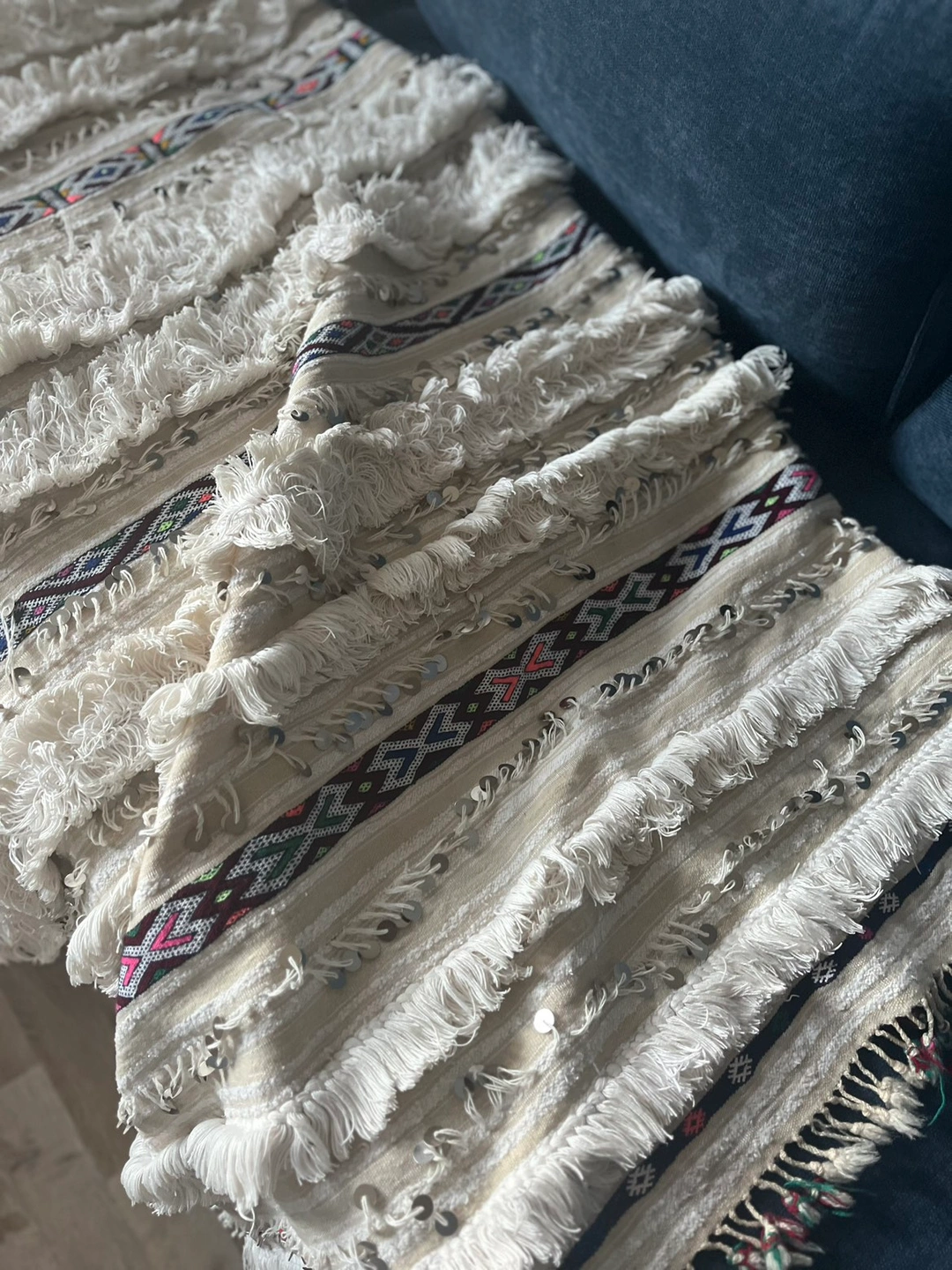 3’10” wide x 5’4” long, with a 2” twisted tassel fringe on both ends. Brand new moroccan hand made handira