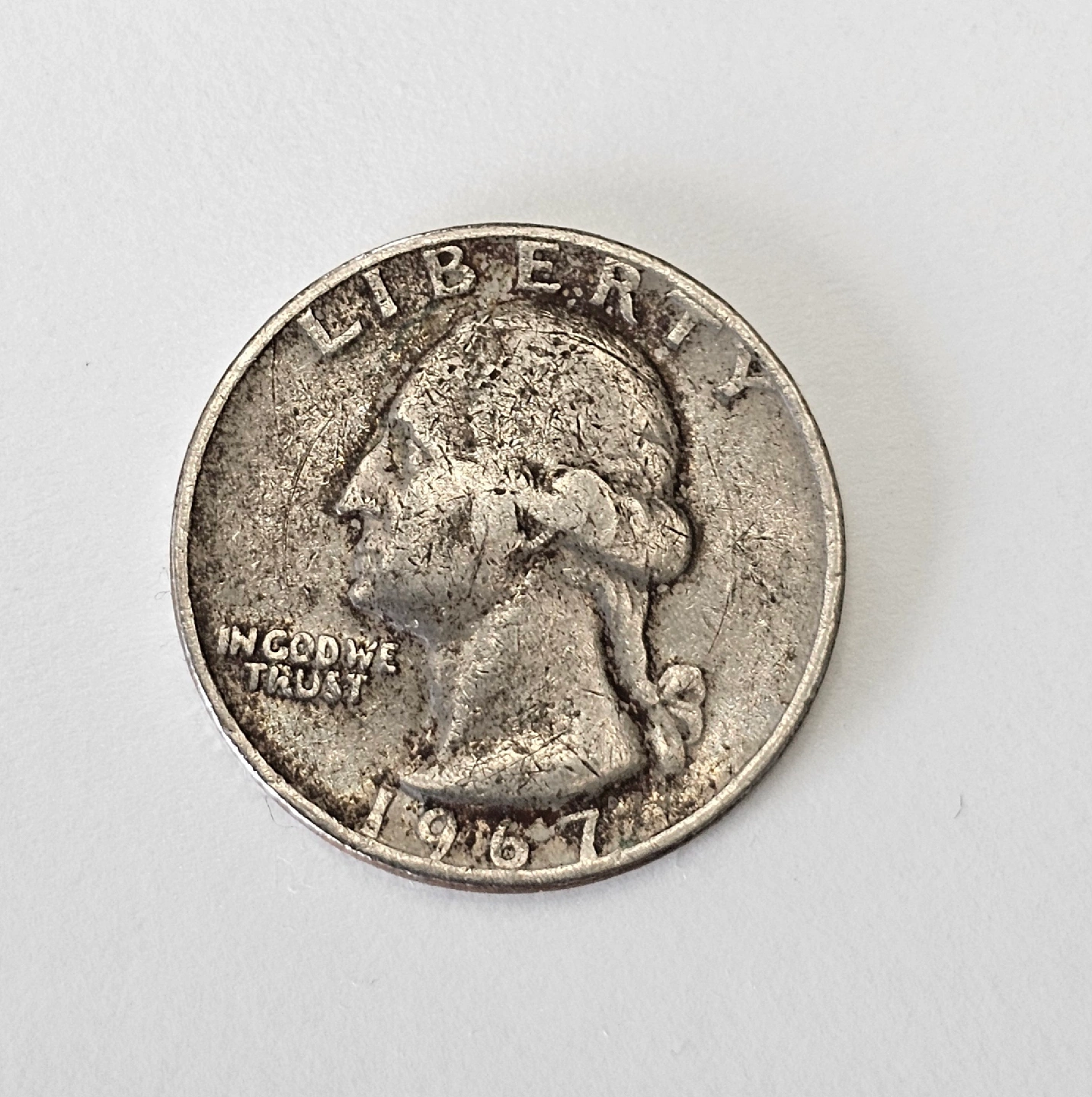 Extremely Rare Historical US Quarter Dollar. 1967 George Washington Mint. Rugged and Worn Condition—Adding to the Value.