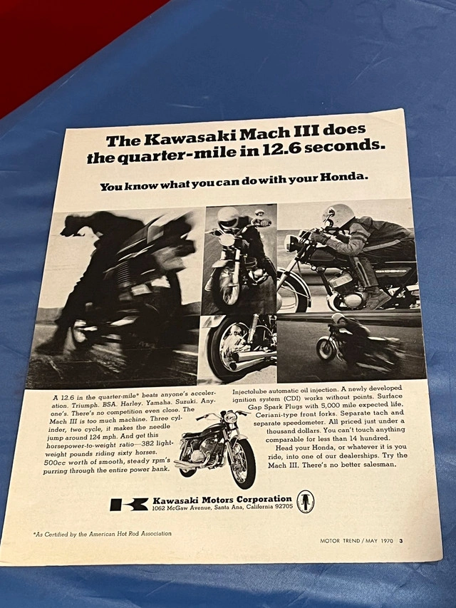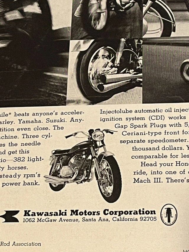 101970 Kawasaki Mach III Motorbike Original Ad Size: 8" X 10-+3/4" More Info: Art For Sale By: Owner Curbside pick up: Yes Cash accepted: Yes
