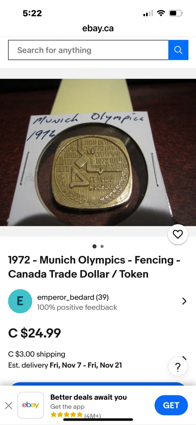 250Nine dollars each 3 25 dollars available limited time Selling a Canada Trade Dollar / Token from the 1972 Munich Olympics. It features the Canadian Olympic Association logo and different sports like fencing, equestrian, track and field, and archery. A neat piece of Canadian Olympic history!