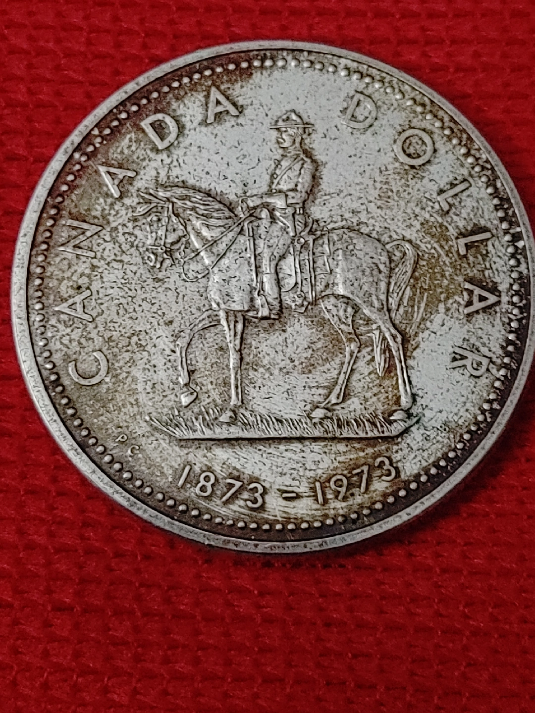 23Selling a 1973 Canadian silver dollar coin. It features a rider on horseback on one side and Queen Elizabeth II on the other. A nice piece for any coin collector!