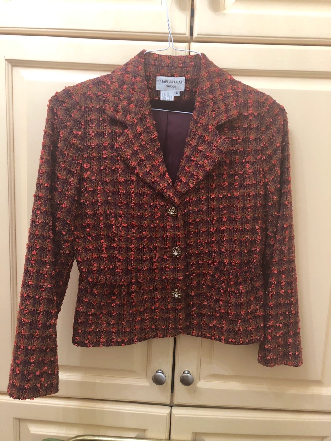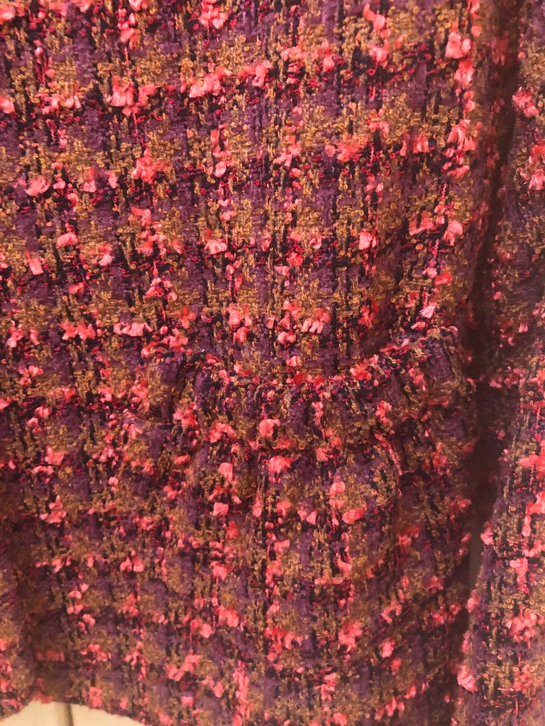 Exquisite tweed in shades of brown, coral & light purple with tiny, tiny ribbon detailing. Lining is immaculate. Rhinestone buttons. Absolutely true to size 4 and the tailoring is brilliant, especially over the shoulders. Vintage designer gem.
